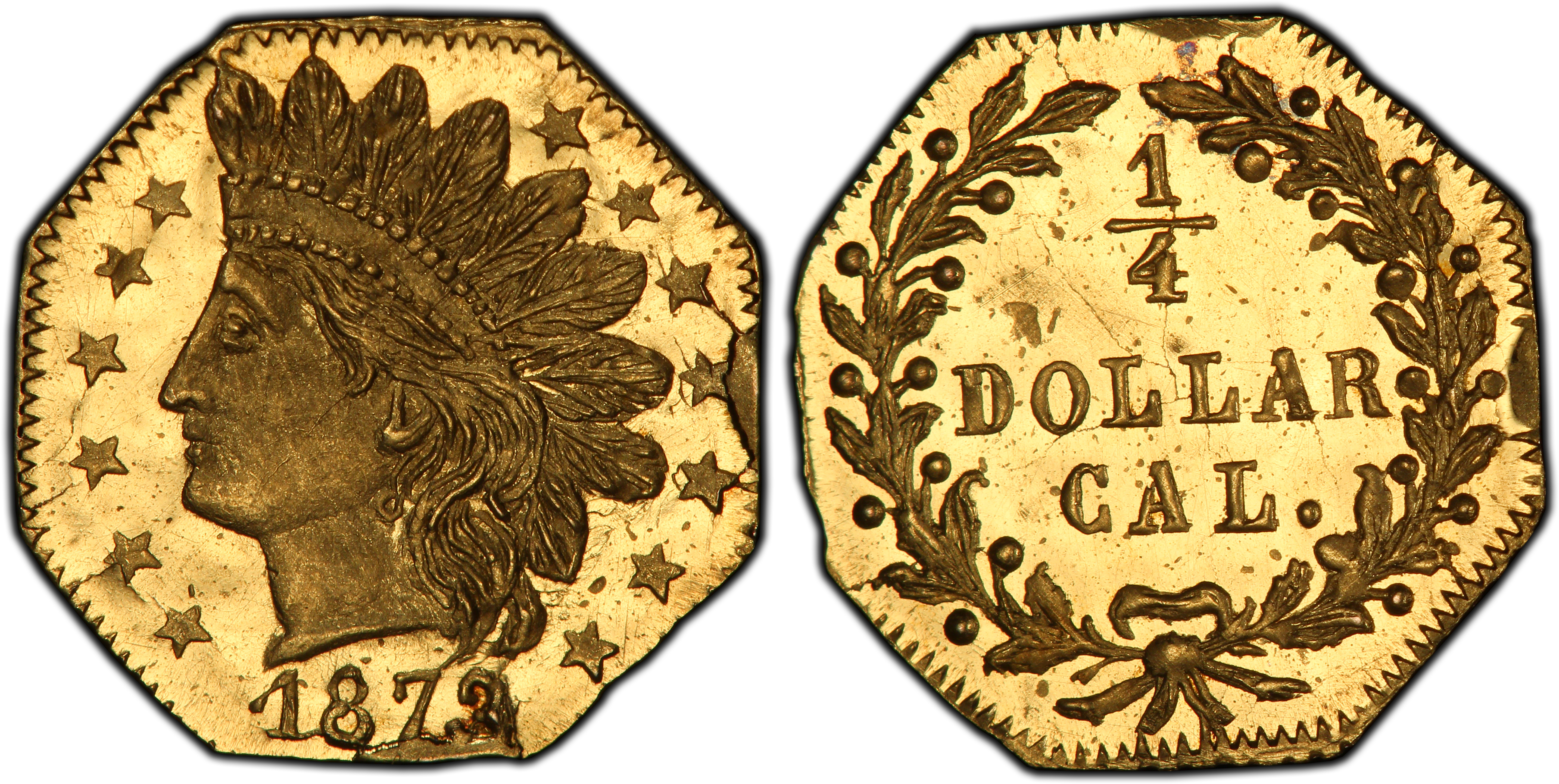 Obverse DescriptionOctagonal planchet. Features a stylized Indian Head portrait facing left, wearing a feathered headdress. The portrait is surrounded by 13 five-pointed stars. The date, 1873, appears below the bust, with the '3' clearly struck over a '2'.