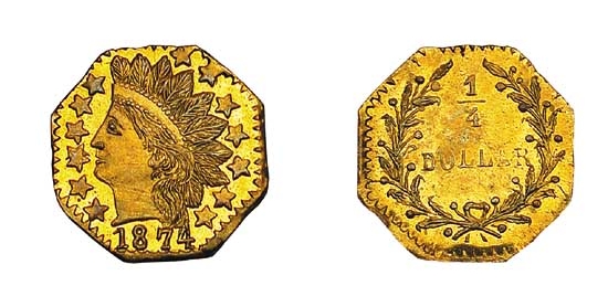 Obverse Inscription Reverse DescriptionA wreath composed of two branches tied together by a bow at the bottom. Within the wreath, the denomination '25 CENTS' is inscribed. The word 'CALIFORNIA' appears above the wreath, hugging the upper octagonal edge. The date '1874' is positioned below the bow of the wreath.