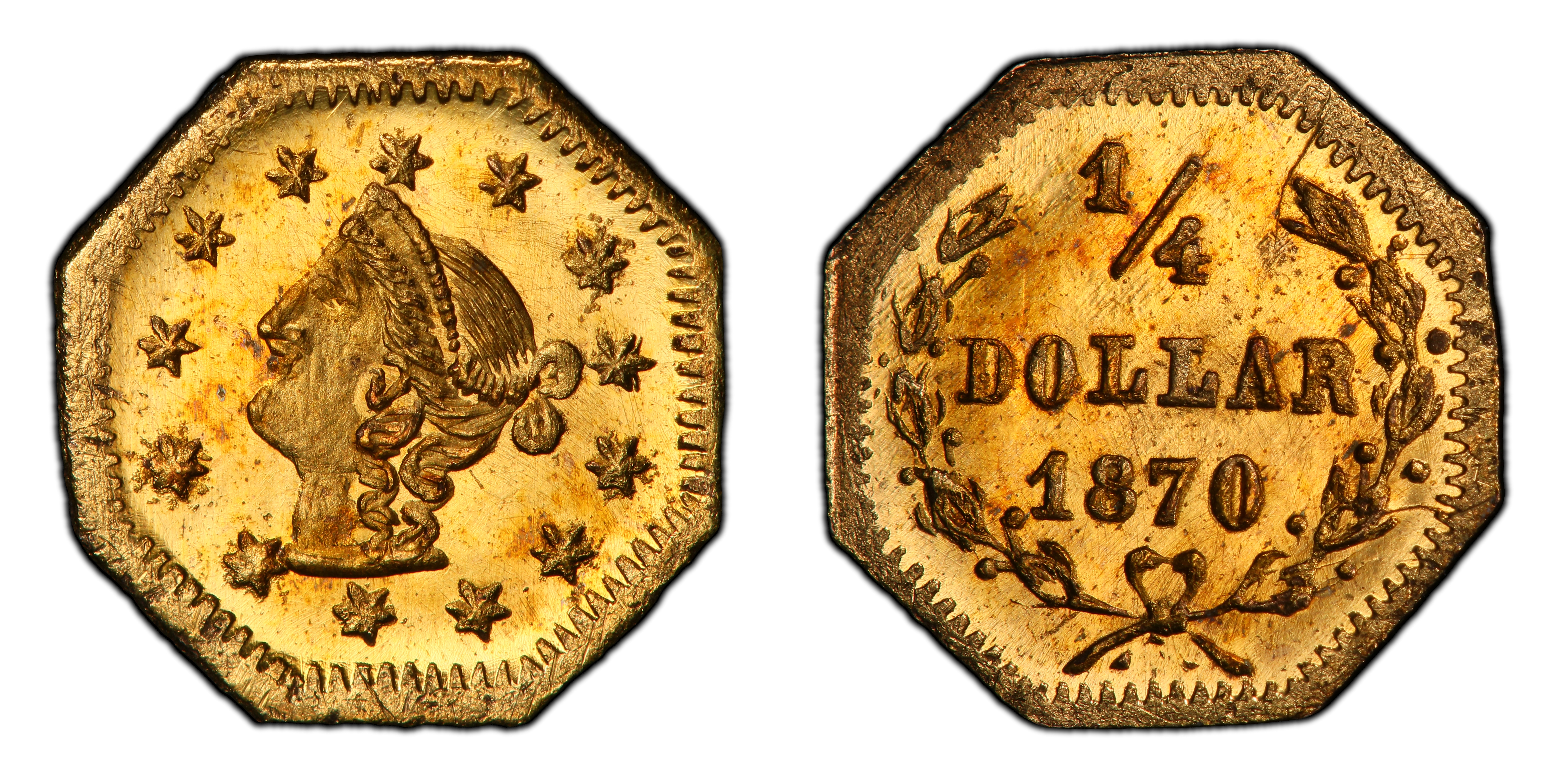 The 1870 25 Cent piece, cataloged as Breen-Gillio 789, is a quintessential example of a 'Period Two' California Fractional Gold coin. Unlike the earlier 'Period One' issues (1852-1857), which were struck to genuinely alleviate a shortage of small denomination coinage during the initial frenzy of the Gold Rush, these later pieces were created for an entirely different purpose. By 1870, the San Francisco Mint was in full operation, and the acute need for private coinage had subsided. Instead, a thriving market for souvenirs and keepsakes had emerged, driven by tourism and a national fascination with the 'Wild West.' Anonymous jewelers in San Francisco capitalized on this by producing vast quantities of these charming but intrinsically deficient gold tokens. The Coinage Act of 1864 had explicitly forbidden private coinage, rendering the manufacture of these denominated pieces technically illegal. However, enforcement was lax, and the pieces were generally marketed as tokens or charms, allowing production to continue until a federal crackdown in the early 1880s. The BG-789 was part of this wave of 'suppressed jewelers' issues.' Struck from gold of inconsistent and often low fineness, they were significantly underweight and never intended to pass as legal tender at face value. Their purpose was to be sold at a premium to tourists or locals who used them in jewelry, as waistcoat pocket pieces, or sent them back East as affordable, glittering mementos of California. The crude but distinctive 'Goofy Head' portrait style of this variety is characteristic of the less refined engraving of the period, a departure from the more formal federal imitations of the 1850s. Today, the BG-789 is appreciated not as a coin of commerce, but as a tangible link to the post-Gold Rush era of California's development and its burgeoning identity as a tourist destination.