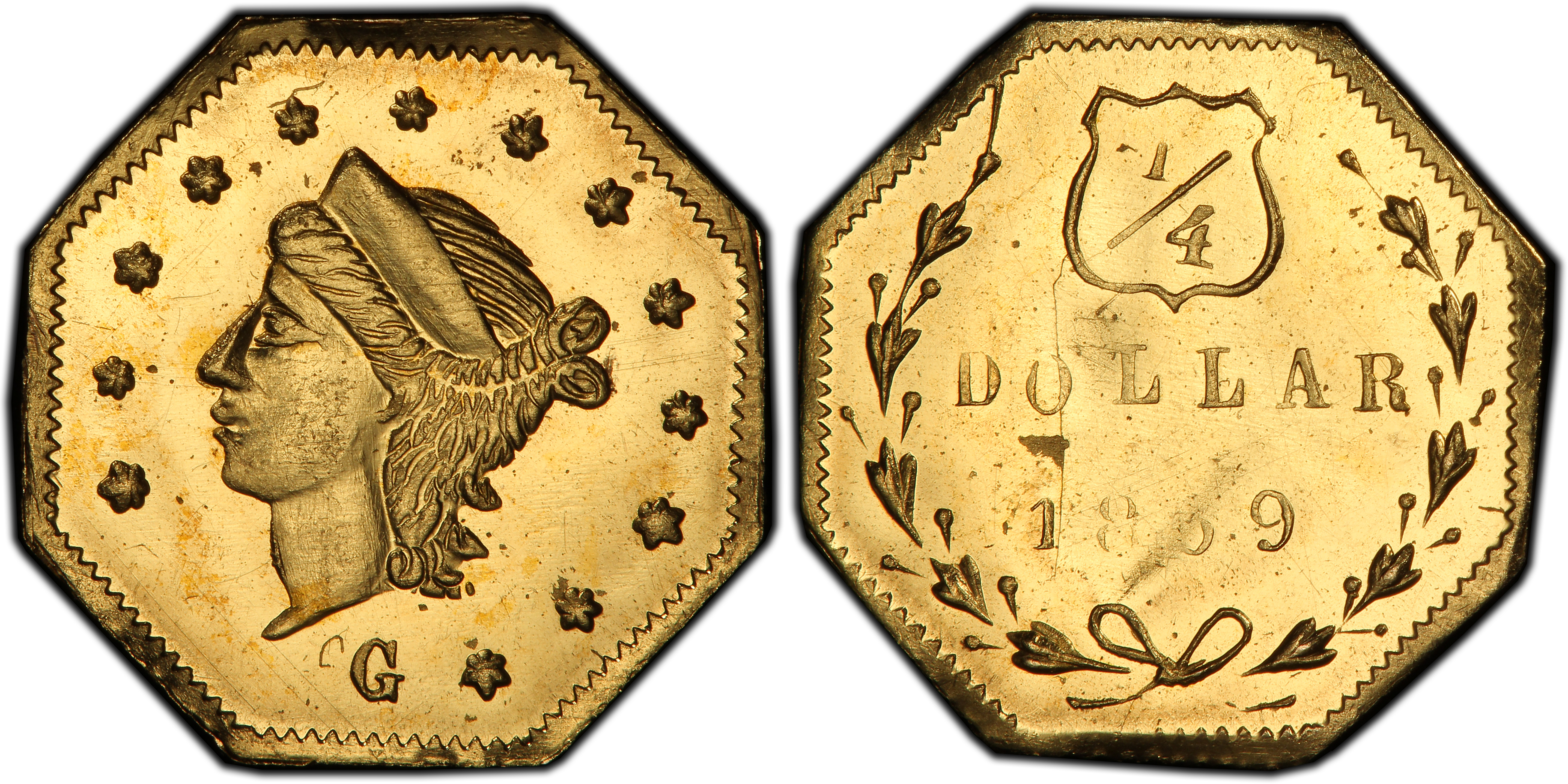 Sought for its direct connection to a famous Gold Rush-era minter, its octagonal shape, clear date, and status as a representative of the 'Jeweler's Issue' period. The BG-748 is a relatively attainable variety within a highly popular and historically rich collecting field.