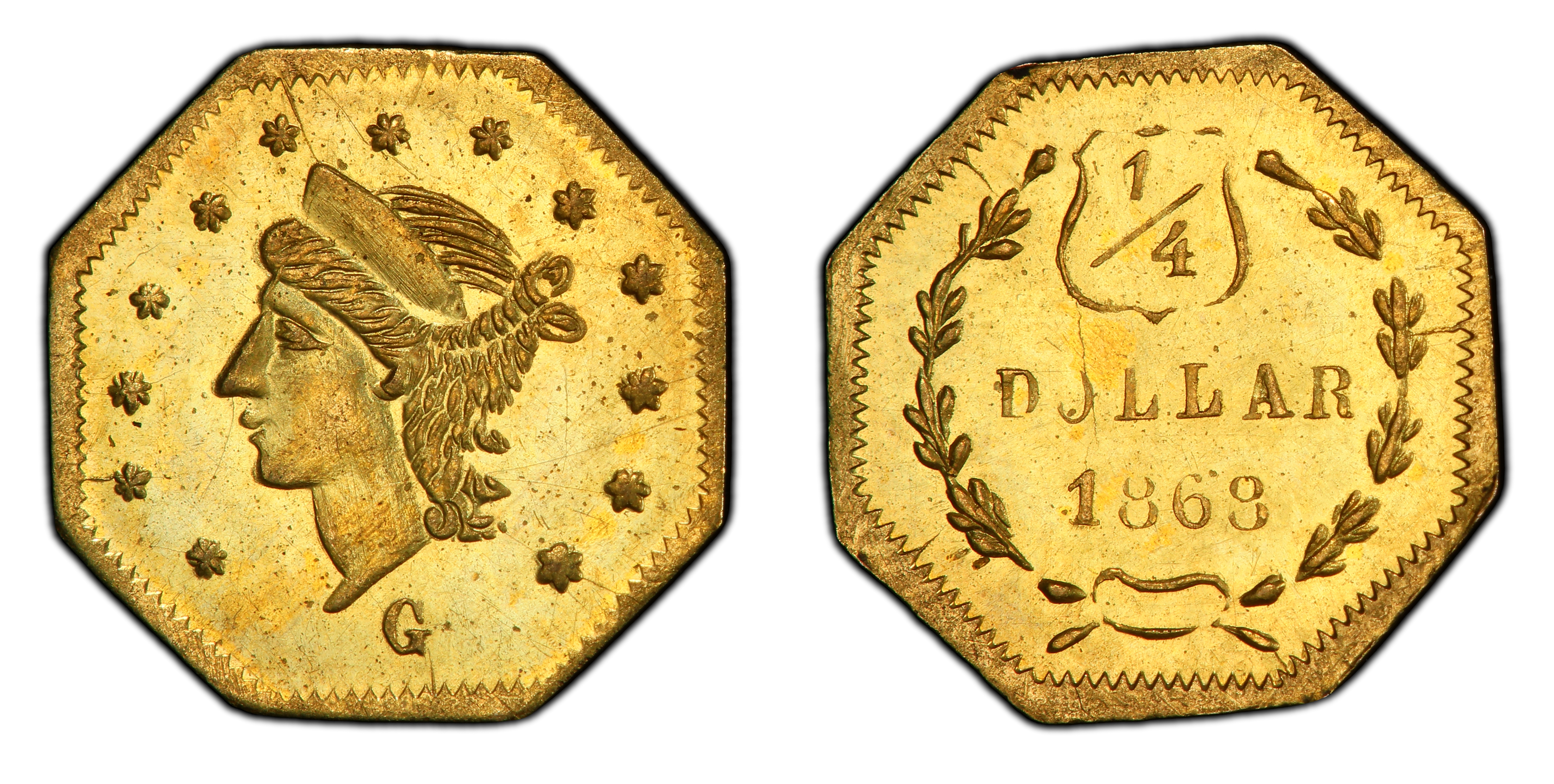 The 1868 BG-745 octagonal 25-cent gold piece emerges from the second major period of California Fractional Gold production (1859-1882). Unlike the 'Period One' (1852-1856) issues, which were struck out of a genuine commercial necessity to alleviate a severe shortage of small-denomination coinage during the initial Gold Rush boom, the pieces from this later era are often termed 'jeweler's issues.' By 1868, the San Francisco Mint was in full operation, supplying federal silver coinage that largely satisfied the region's needs for small change. Consequently, the impetus for private gold fractional issues shifted from circulation to novelty. These small gold pieces were primarily manufactured by San Francisco jewelers and sold as souvenirs, keepsakes for tourists, and curiosities that harkened back to the more chaotic early days of the Gold Rush. The Coinage Act of 1864 had officially prohibited the private issuance of coinage, placing these manufacturers on precarious legal ground. Despite this, production continued quietly for nearly two more decades. The BG-745 is a product of this environment, likely struck using the traditional hammer method, where dies were struck by hand. This process often resulted in coins with inconsistent strike quality, a characteristic feature of the series. While they did not circulate in the traditional sense, they represent a continuation of California's unique numismatic identity and the enduring allure of gold in the American West. Their creation speaks to a burgeoning tourist trade in San Francisco and a nostalgic public eager to own a tangible, golden piece of the Gold Rush story.