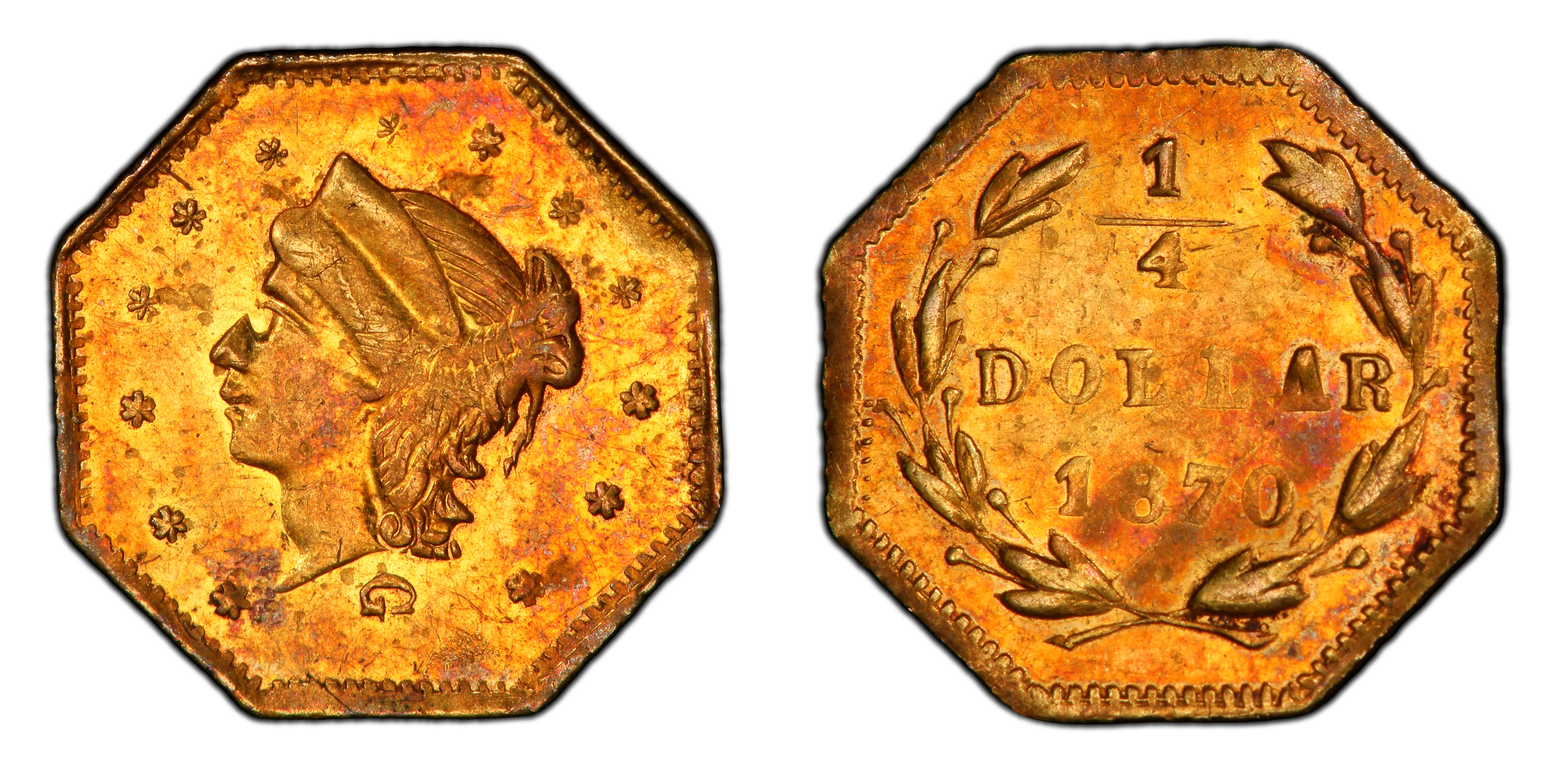 The 1870 G25C BG-753 is a quintessential example of a 'Period Two' California Fractional Gold piece, a fascinating and complex series born from the economic realities of the American West. Following the initial 1848 gold discovery at Sutter's Mill, California was inundated with prospectors and entrepreneurs, creating a vibrant but chaotic economy. A severe shortage of circulating small change plagued daily commerce; transactions were often conducted with pinches of gold dust, an imprecise and contentious method. To fill this void, private jewelers and metallurgists began striking their own small-denomination gold coins in 1852. These 'Period One' (1852-1856) issues were generally intended for circulation and were struck with a gold content approaching their face value. However, the BG-753 belongs to the second major era of production (1859-1882). By 1870, the San Francisco Mint had been in full operation for years, alleviating the initial coin shortage. The purpose of fractional gold had shifted; they were now primarily produced as souvenirs and curiosities for tourists and for use in the jewelry trade. These 'jeweler's issues' were often significantly underweight and valued more for their novelty than their intrinsic worth. The Coinage Act of 1864 had officially prohibited private coinage, but enforcement was lax in the West until the early 1880s, allowing firms like Robert B. Gray & Co. to continue production. Gray, a San Francisco die-sinker and engraver, was a prolific producer of these pieces, identified by the characteristic 'G' initial on many of his dies. These tiny, octagonal coins, crudely struck by hand-operated presses, served as tangible mementos of the Gold Rush's enduring legacy, long after its initial frenzy had passed. Their existence speaks to a transitional period in California's economy, where the lines between currency, commodity, and collectible were beautifully blurred.