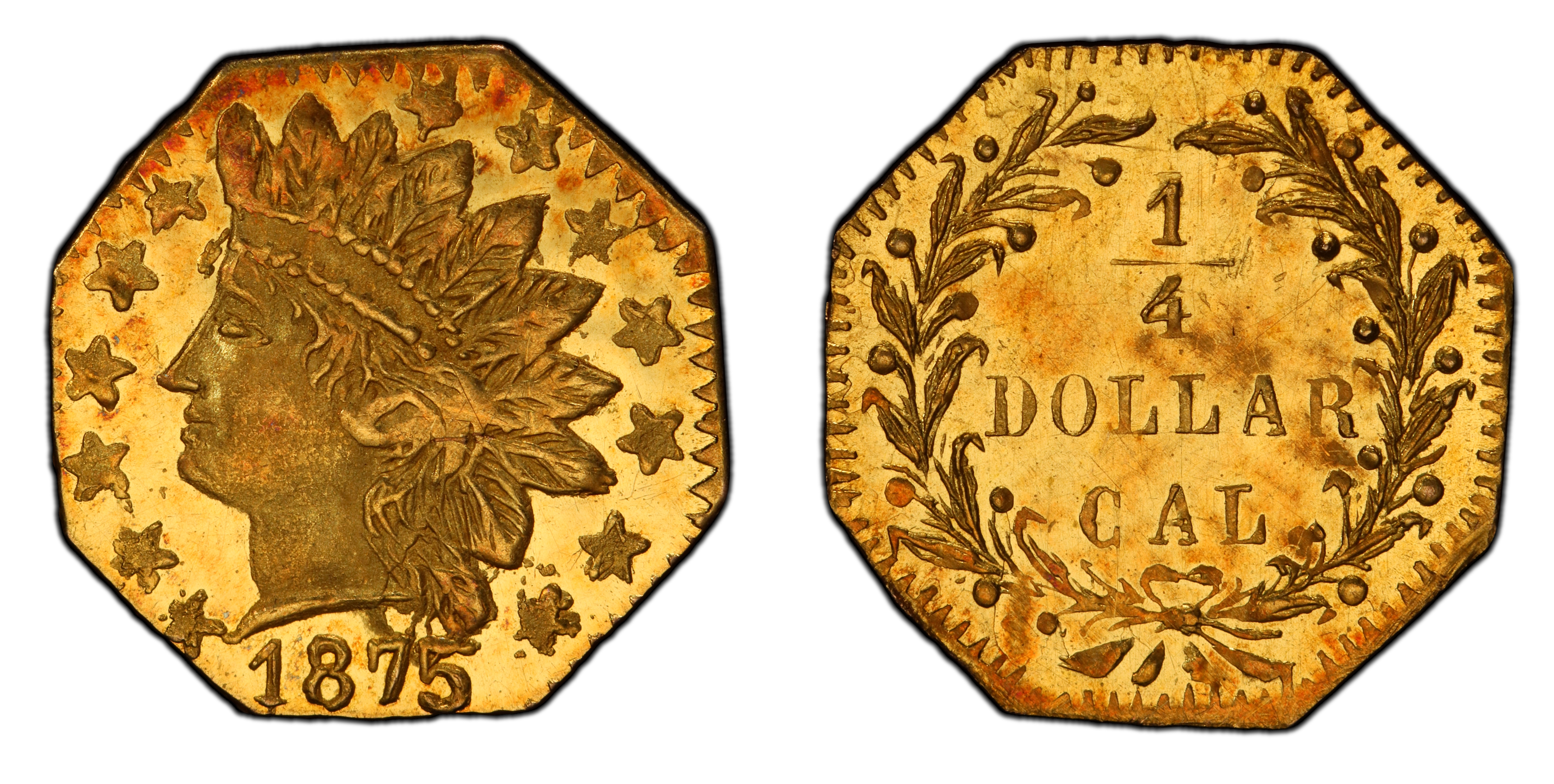 The 1875 Octagonal Indian Head Quarter Dollar, cataloged as BG-796, is a quintessential example of a 'Period Two' California Fractional Gold piece. These later issues (1858-1882) stand in contrast to the earlier 'Period One' coins (1852-1857), which were struck out of genuine commercial necessity to alleviate a severe shortage of small change during the initial frenzy of the Gold Rush. By the mid-1870s, the San Francisco Mint was in full operation and the acute need for private fractional coinage had long since passed. Instead, these miniature gold pieces were produced and sold primarily as souvenirs, jewelry, and curiosities for tourists and locals nostalgic for the Gold Rush era. The minter of the BG-790 through BG-799 series, Christopher Ferdinand Mohrig, was a San Francisco jeweler who actively produced these popular tokens. His enterprise, however, operated in a legally gray area. The Coinage Act of 1864 had explicitly prohibited private coinage, but enforcement was lax on the West Coast for over a decade. This tolerance ended in the mid-1870s when the U.S. Secret Service, under the direction of Chief James J. Brooks, began a concerted crackdown on private minters, viewing their products as a potential source of fraud. Mohrig himself was arrested on August 10, 1876, and his dies and remaining inventory were confiscated and destroyed. This law enforcement action abruptly ended his production and contributes to the relative scarcity of his later issues. The BG-796, therefore, is not a coin that ever served as money in the conventional sense but is a tangible link to the romantic aftermath of the Gold Rush and the federal government's efforts to centralize and control the nation's currency.