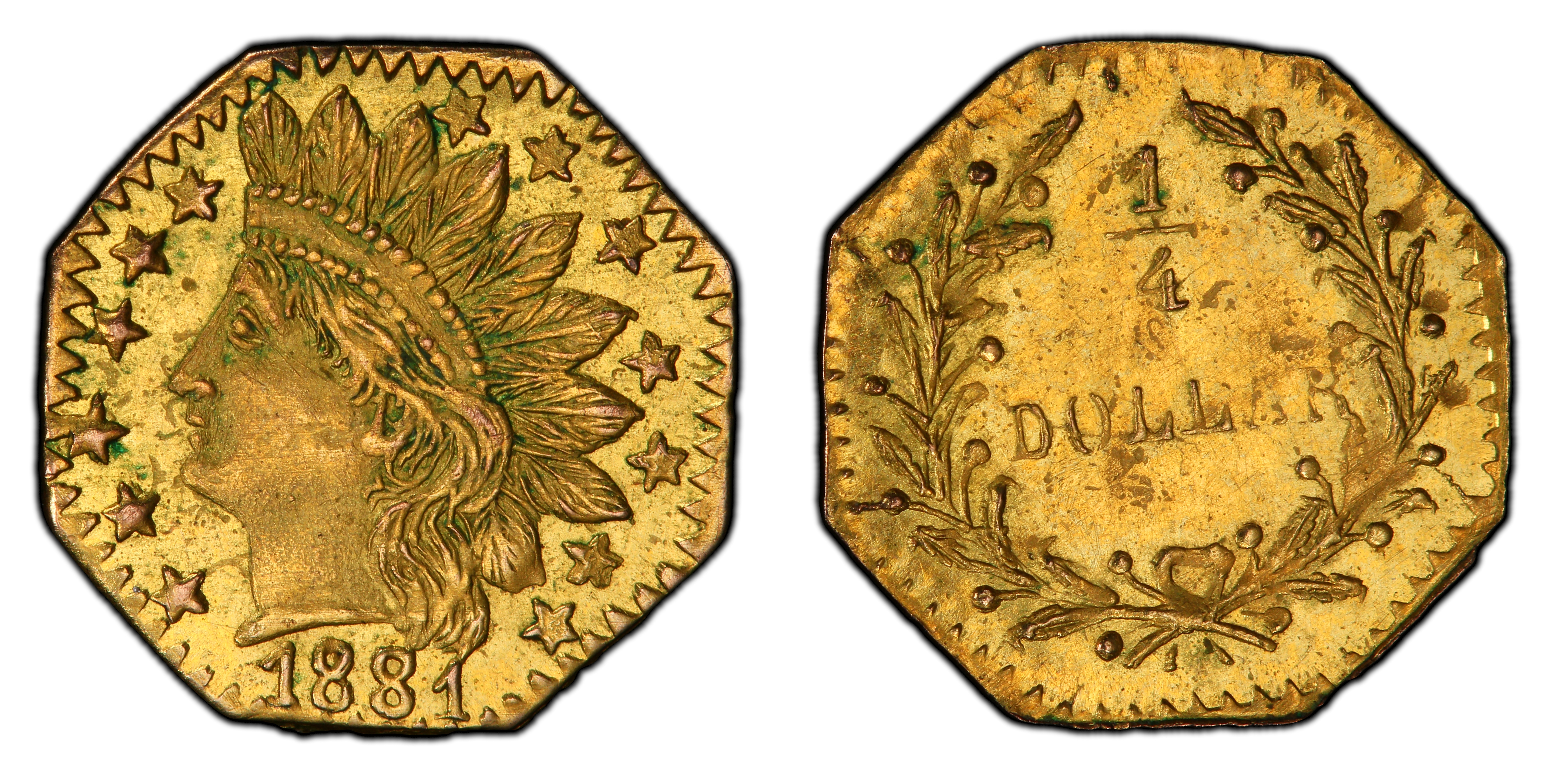 The 1881 25-cent BG-799M is a quintessential example of a 'Period Two' California Fractional Gold piece. These later issues (1858-1882) stand in contrast to the 'Period One' (1852-1857) coins, which were struck out of genuine commercial necessity to alleviate a severe shortage of small change during the initial frenzy of the Gold Rush. By the 1880s, the economic landscape of California had matured significantly. The San Francisco Mint was in full operation, supplying ample federal coinage for daily transactions. The acute need for privately-minted fractional gold had long since vanished. Instead, these miniature gold pieces had found a new and enduring market as souvenirs and keepsakes. San Francisco had become a major tourist destination, and visitors from the East Coast and Europe were fascinated by the romantic legacy of the '49ers. Jewelers and private minters, such as Christopher Ferdinand Mohrig, capitalized on this by producing beautifully crafted, albeit often debased, gold tokens that evoked the spirit of the Gold Rush. These pieces were not intended for circulation but were sold as charms, mementos, and additions to jewelry. The Coinage Act of 1864 had made private coinage illegal, but the law was not aggressively enforced against these small, denominated tokens until the U.S. Secret Service launched a crackdown in the early 1880s. This pressure effectively ended the era of denominated fractional gold production by 1883. Mohrig himself had been arrested in 1876 for his coining activities, leading to the confiscation and destruction of many of his dies and coins, which explains the rarity of several varieties within his prolific output (BG-790 through BG-799V). The 1881 BG-799M represents one of the final expressions of this uniquely Californian numismatic tradition, a tangible link to the fading memory of the Gold Rush, produced just before federal enforcement closed the chapter on private gold coinage in the United States.