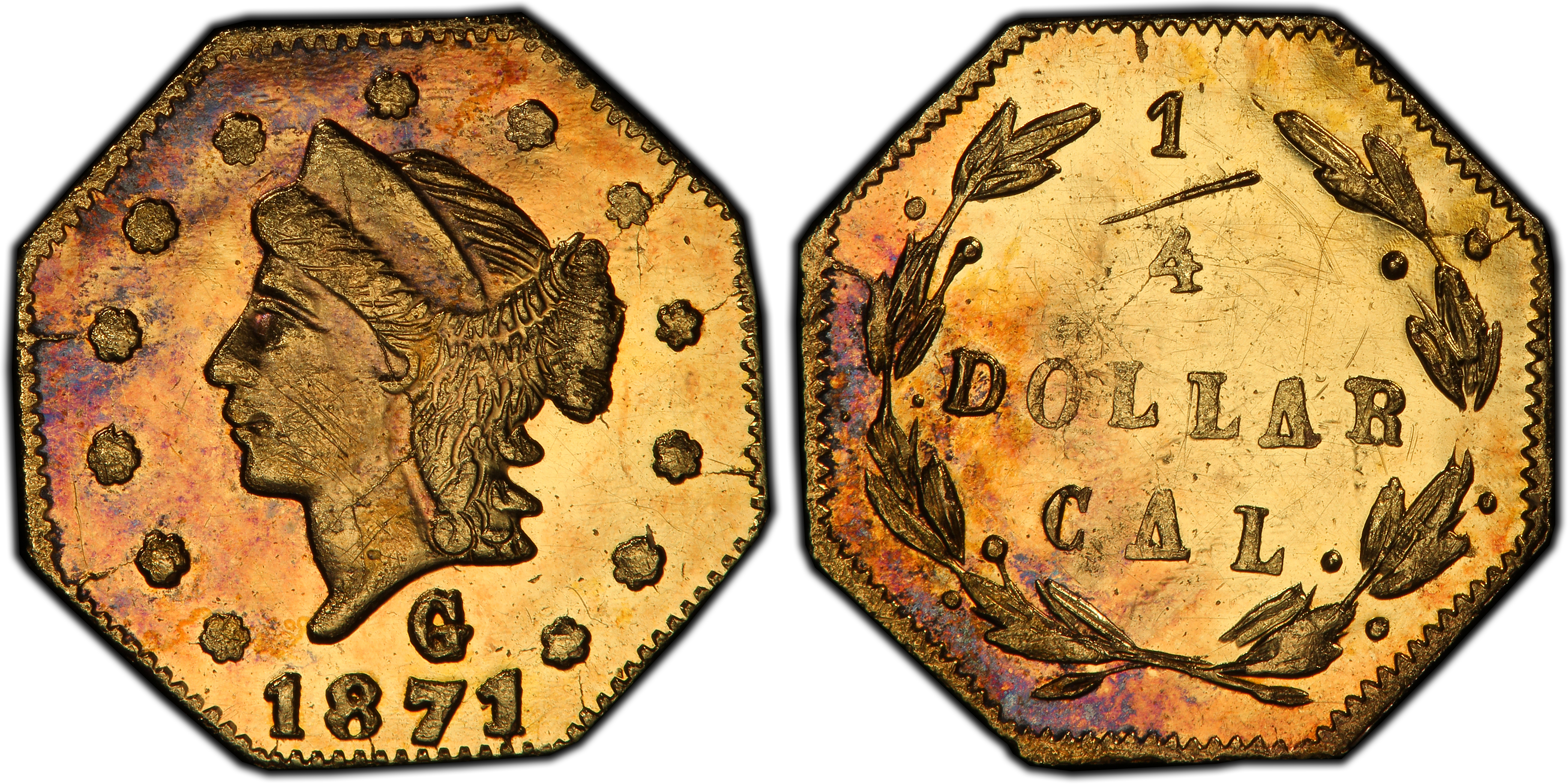 The 1871 G25C BG-767 is a quintessential example of 'Period Two' California Fractional Gold, a fascinating and complex series born from the economic realities of the American West. The initial California Gold Rush created an immense influx of population and gold dust, but a severe shortage of small denomination coinage for daily transactions. This led to the 'Period One' (1852-1857) issues, which were privately minted with the genuine intent of serving as circulating currency. However, by the late 1850s, the landscape had changed. The U.S. Mint in San Francisco was in full operation, and the novelty of the tiny gold pieces had captured the public's imagination. Enterprising jewelers, like Robert B. Gray, recognized a new market: souvenirs. The 'Period Two' issues (1858-1882), to which the BG-767 belongs, were struck primarily for sale as keepsakes, jewelry, and mementos of the romanticized Gold Rush era. These pieces were often deliberately underweight, containing less than their face value in gold, a fact that was of little concern to buyers who did not intend to spend them. Robert B. Gray & Co. was a prolific producer, having purchased the business of another jeweler, Antoine Louis Nouzillet, in the late 1850s. Gray's issues are identifiable by the small 'G' monogram on the obverse. The year 1871 was significant as it marked the end of Gray's involvement; he sold his interests to the California Jewelry Co. during that year, making the 1871-G issues among his last. The Coinage Act of 1864 had made private coinage illegal, but the law was weakly enforced in the West, allowing jewelers to continue production, often using earlier dates to feign legitimacy. The BG-767, with its explicit 1871 date, demonstrates the boldness of these minters in a period when their craft was legally dubious but commercially successful. These tiny octagonal gold pieces are not just coins; they are artifacts of a transitioning economy, embodying the shift from necessity-driven currency to commercial nostalgia.