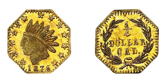 The 1876 BG-787 25 Cent piece is a product of the second period (1858-1882) of California Fractional Gold production. Unlike the 'Period One' issues (1852-1857), which were struck out of a genuine necessity for small-denomination circulating coinage during the height of the Gold Rush, these later pieces were created primarily as souvenirs and for the jewelry trade. By the mid-1870s, the United States Mint in San Francisco was in full operation, producing ample quantities of federal silver and gold coins, thus obviating the commercial need for private fractional gold. However, the romance of the Gold Rush and the novelty of tiny gold coins sustained a vibrant market for these tokens. Jewelers in San Francisco and other cities continued to strike them, often backdating them to the 1850s to enhance their appeal. The Coinage Act of 1864 had made private coinage illegal, but enforcement was lax, particularly for pieces clearly intended as novelties rather than circulating currency. These 'suppressed jewelers' issues,' as termed by numismatists Walter Breen and Ronald Gillio, often featured new designs, such as the Indian Head motif, which was not used on Period One fractionals but was popular on contemporary federal coinage like the Indian Head Cent. The 1876 date of the BG-787 is significant as it coincided with the nation's Centennial celebration, an event that spurred the creation of numerous medals and tokens. It is highly probable that this piece was struck to capitalize on the patriotic and nostalgic fervor of the time. Production methods remained crude, often employing a simple hammer-striking process, which resulted in coins of varying strike quality and sometimes inconsistent planchet thickness. The gold content was also not standardized and was typically below face value, solidifying their status as tokens rather than true coins. Production of all such pieces ceased by 1883 after the Secret Service began to strictly enforce the 1864 Act, bringing an end to this fascinating chapter of American numismatics.