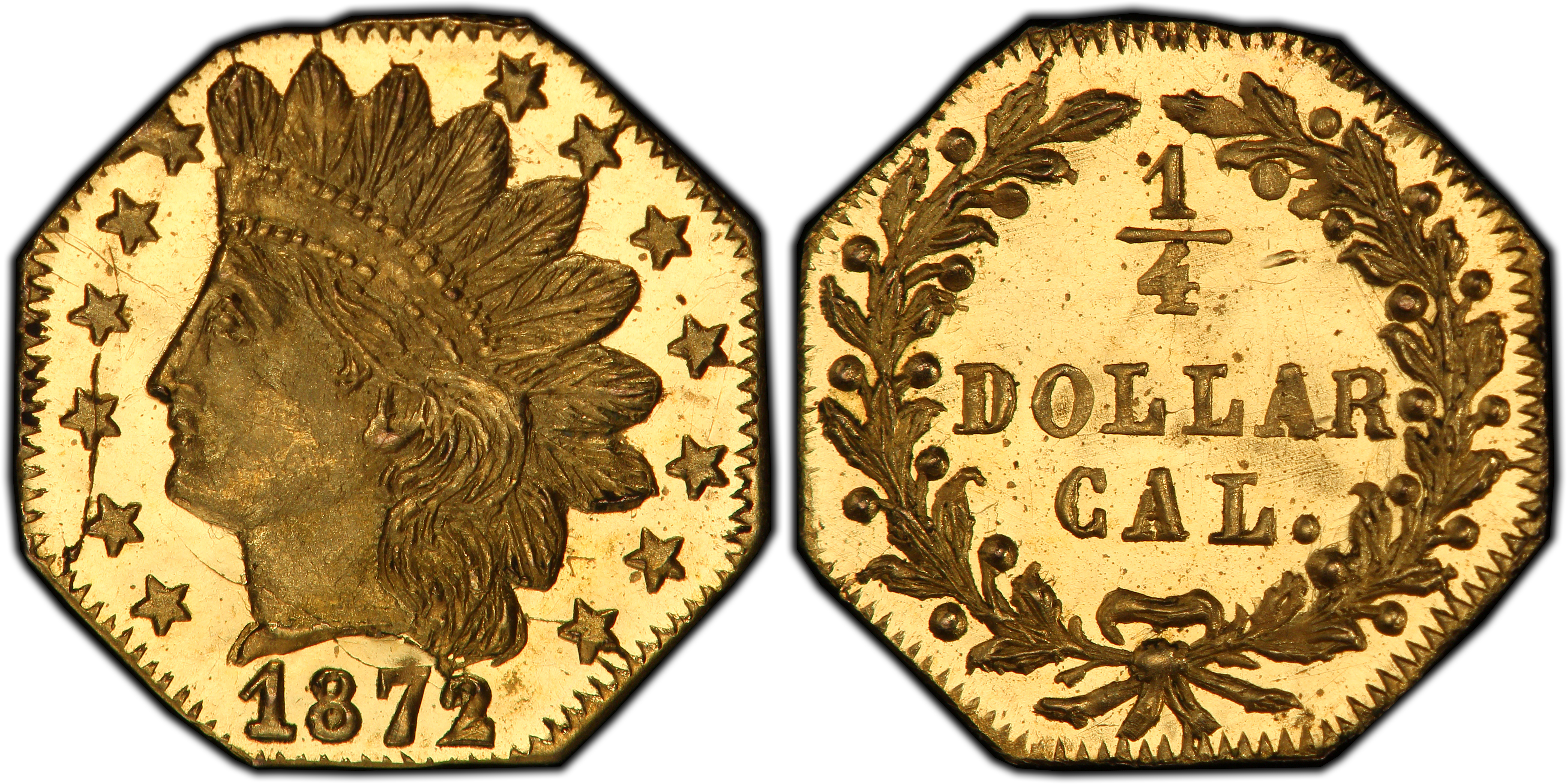 Reverse DescriptionAn octagonal planchet with the denomination '1/4' at the center, surrounded by a wreath composed of two branches tied with a bow at the bottom. The legend 'CALIFORNIA GOLD' is inscribed outside the wreath along the upper border, often abbreviated as 'CAL'.