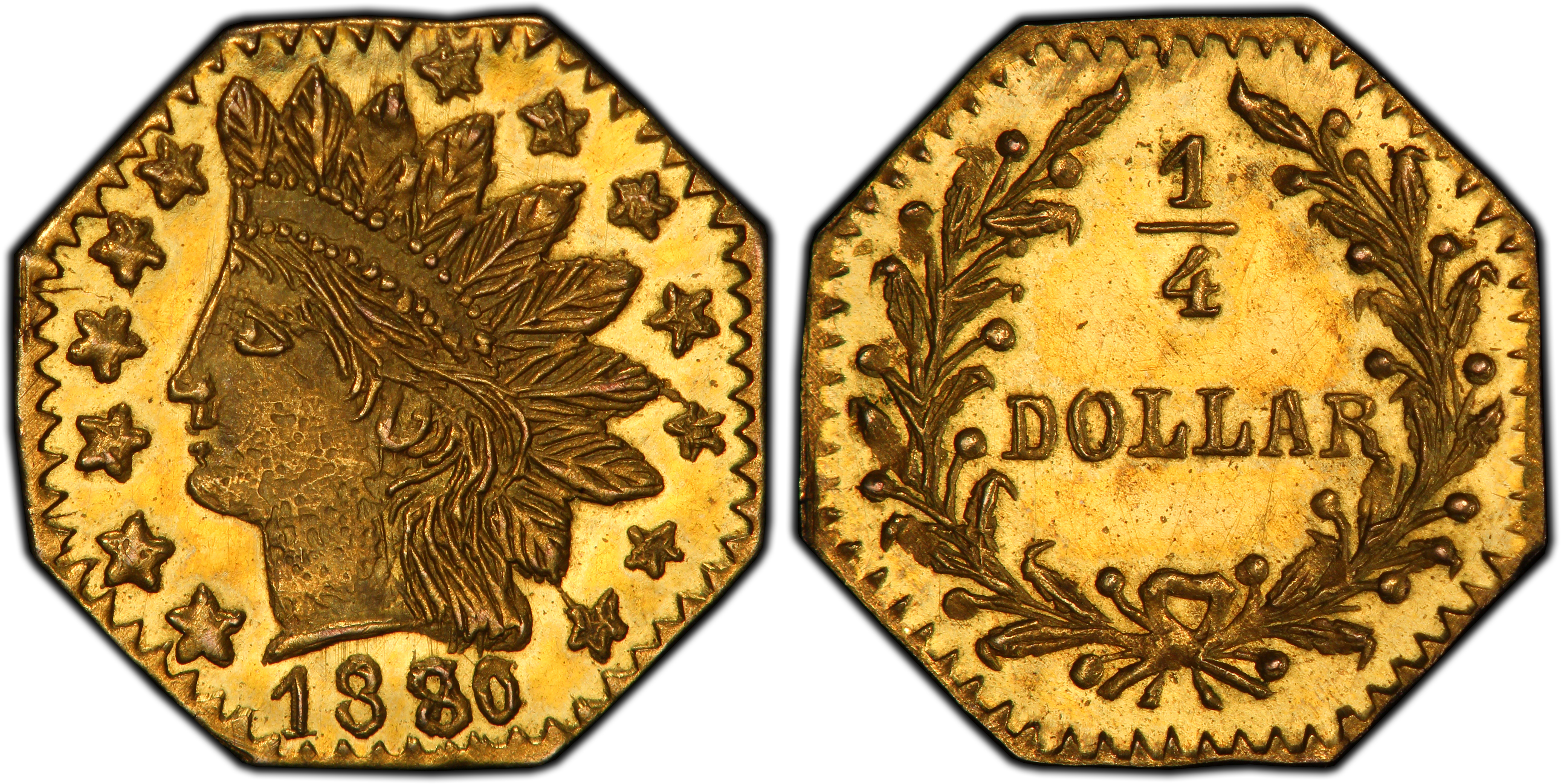 Obverse DescriptionAn octagonal planchet featuring a Native American female portrait facing left, often referred to as an 'Indian Head'. The portrait is adorned with a feathered headdress. Thirteen stars encircle the portrait along the angled rims. The date, 1880, is below the bust. On this variety, clear remnants of the underlying '70' from the original 1870 die are visible under magnification, most prominently within the final two digits of the date.