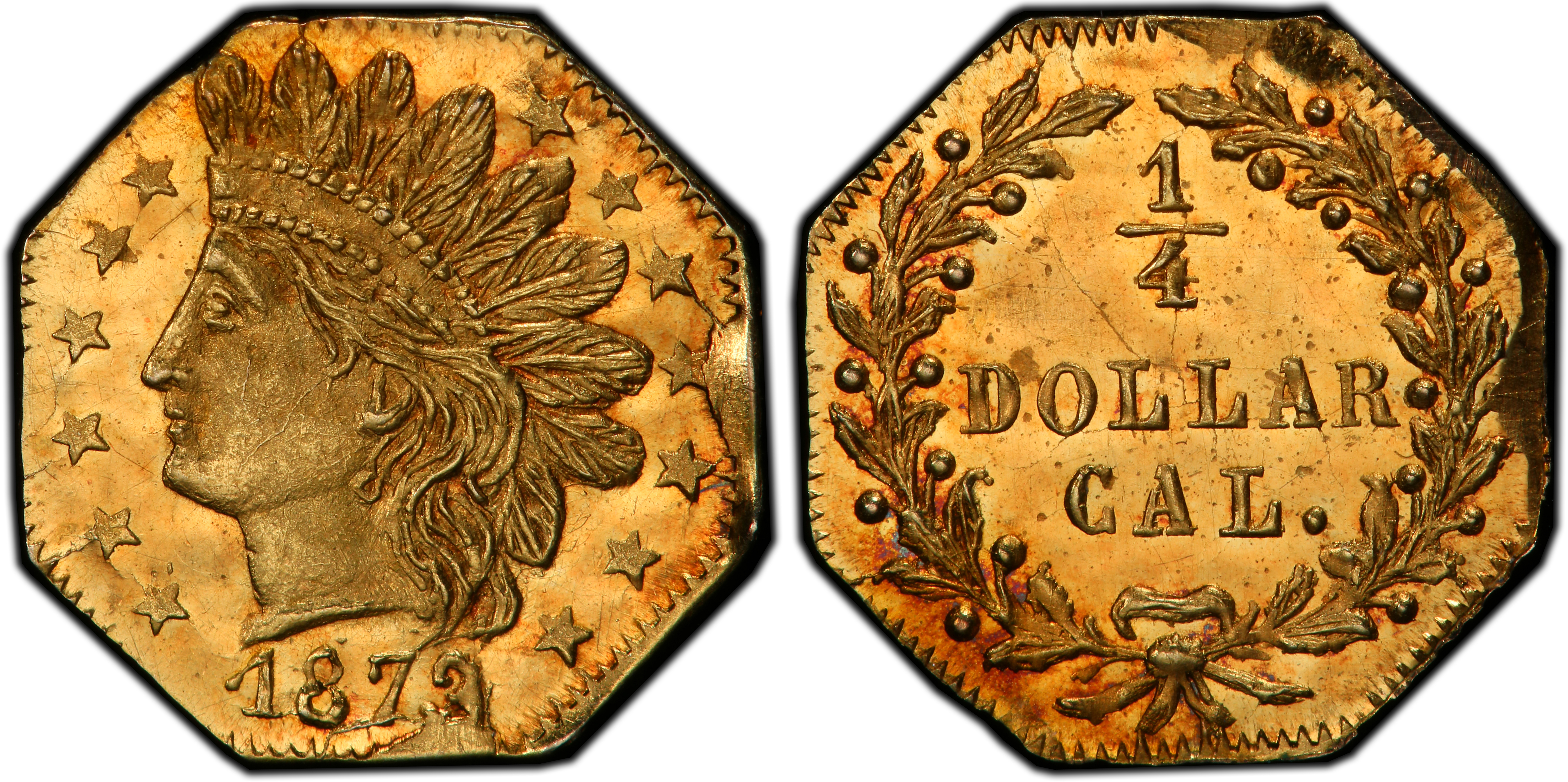The 1873/2 25C BG-792 is a fascinating relic from the 'Period Two' (1858-1882) of California Fractional Gold production. Unlike the earlier 'Period One' issues which were struck out of genuine commercial necessity to alleviate a severe shortage of small change during the initial Gold Rush, the Period Two pieces were primarily created as souvenirs and novelty items for tourists and collectors. By the 1870s, the San Francisco Mint was in full operation, producing ample federal coinage for the region. The persistent demand for tiny gold coins was now driven by nostalgia for the '49er days and the desire for unique keepsakes from the Golden State. Jewelers in San Francisco, many of whom remain anonymous, continued to strike these miniature gold tokens, often with fanciful designs like Indian Heads, which were more exotic than the standard Liberty Head motifs that mimicked federal coinage. These jewelers' issues were typically made with less gold content than their face value would imply, functioning as tokens rather than true currency. The Coinage Act of 1864 had made private coinage illegal, but the law was not strictly enforced against these small, privately-issued tokens until 1883. This legal gray area allowed for a prolific output of hundreds of distinct varieties throughout the 1860s and 1870s. The BG-792, with its clear overdate (a '3' punched over a '2'), is a testament to the ad-hoc nature of this production. Dies were often re-used and re-purposed from year to year to save on costs, leading to numerous mules and overdates that are highly prized by specialists today. As an octagonal piece with an Indian Head motif, the BG-792 captures the quintessential aesthetic of the later souvenir period of fractional gold, representing a tangible link to the romanticized memory of the California Gold Rush.