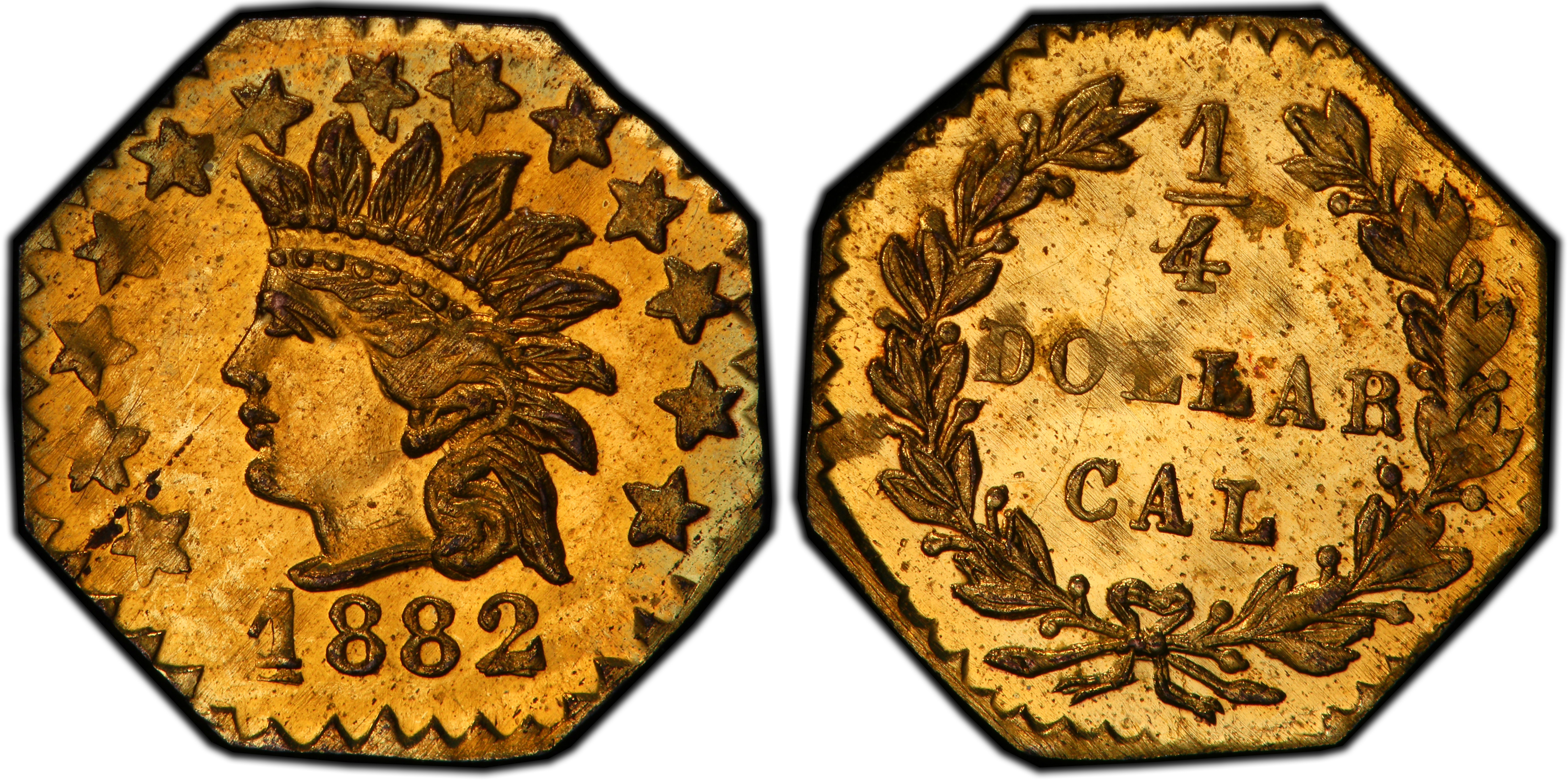 The 1882 25C BG-799CC represents the final chapter of the fascinating and complex series of California Fractional Gold. It is a 'Period Two' (1858-1882) issue, a distinct class of private coinage born not from a dire need for small change as its 'Period One' predecessors were, but from a burgeoning souvenir and jewelry market. By the 1880s, the initial chaos of the Gold Rush had subsided, and the San Francisco Mint was in full operation, obviating the need for private fractional currency. However, the allure of California and the Gold Rush was a powerful marketing tool. San Francisco jewelers, many of whom had produced the earlier, functional pieces, adapted their operations to create these small, attractive gold tokens for tourists and for use in jewelry. These pieces were often intentionally underweight relative to their face value, functioning more as gilded tokens than true coinage. The year 1882 is particularly significant as it marks the last year of tolerated production. The Coinage Act of 1864 had already made private coinage illegal, but the law was not strictly enforced against these small souvenir pieces until 1883. At that point, the U.S. Secret Service, under the direction of the zealous James J. Brooks, launched a crackdown, seizing dies and equipment from the jewelers and effectively ending the era of denominated private gold. Pieces produced after this date are typically undenominated 'charms' to circumvent the law. The BG-799CC, therefore, stands as one of the very last of its kind, a final expression of a uniquely Californian numismatic tradition before federal authority closed the chapter for good. Its existence is a testament to the enduring romanticism of the Gold Rush and the entrepreneurial spirit of the San Francisco artisans who catered to it.
