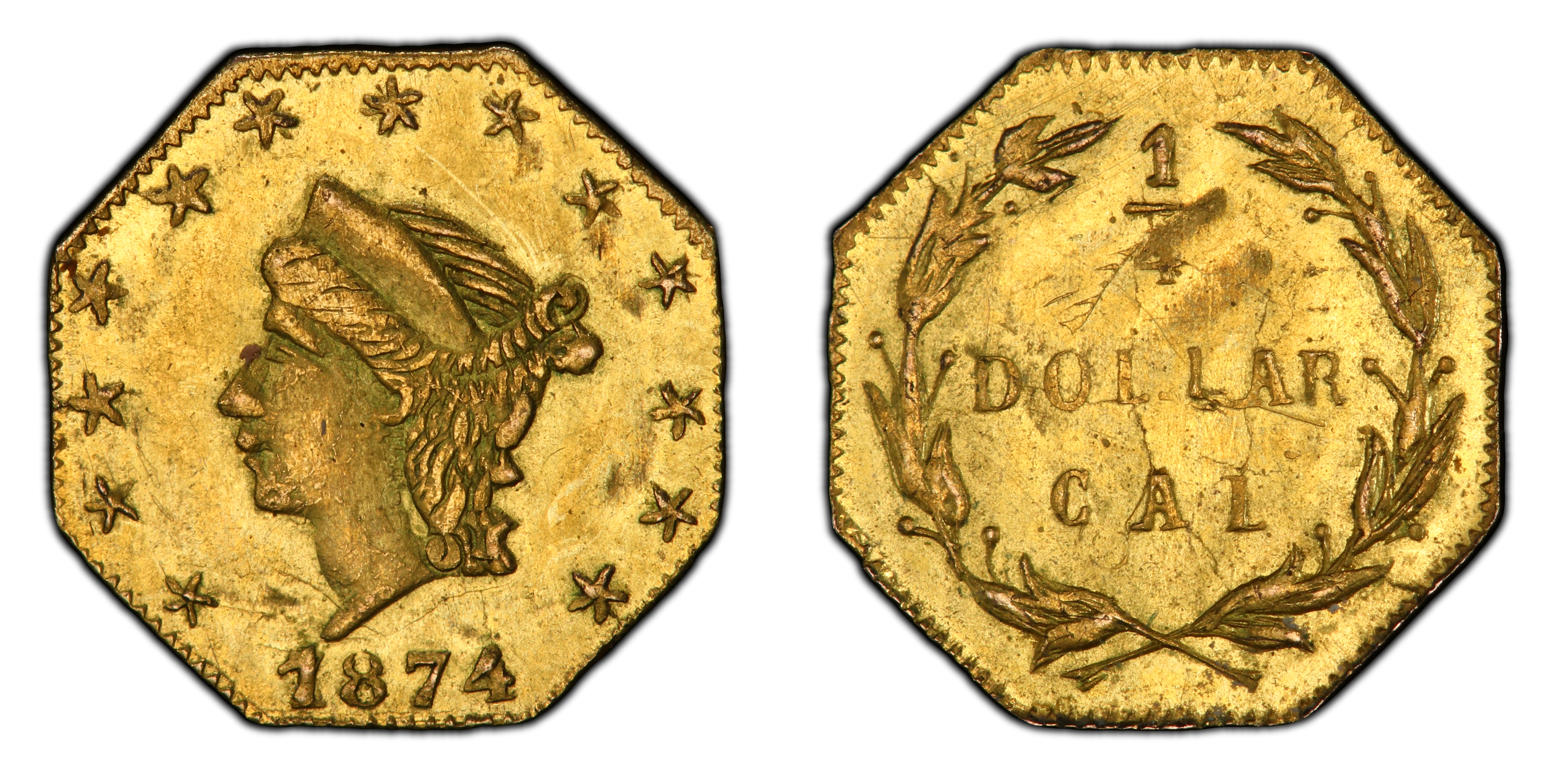 This variety appeals to collectors for its octagonal shape, the clear '1874/1874' overdate feature, its attribution to a specific minter, and as a high-quality example of a Period Two 'jeweler's issue'.