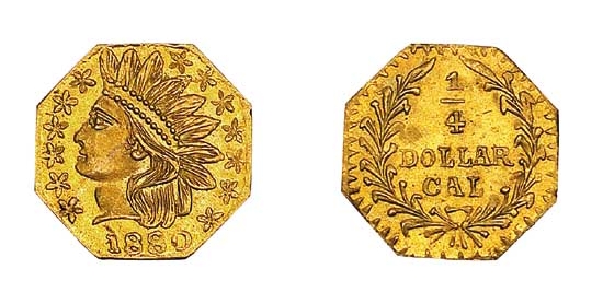 Obverse DescriptionAn octagonal planchet featuring a stylized Indian Head facing left, a common motif for the series. The portrait details are often crudely rendered compared to federal coinage. The date '1880' is below the bust.