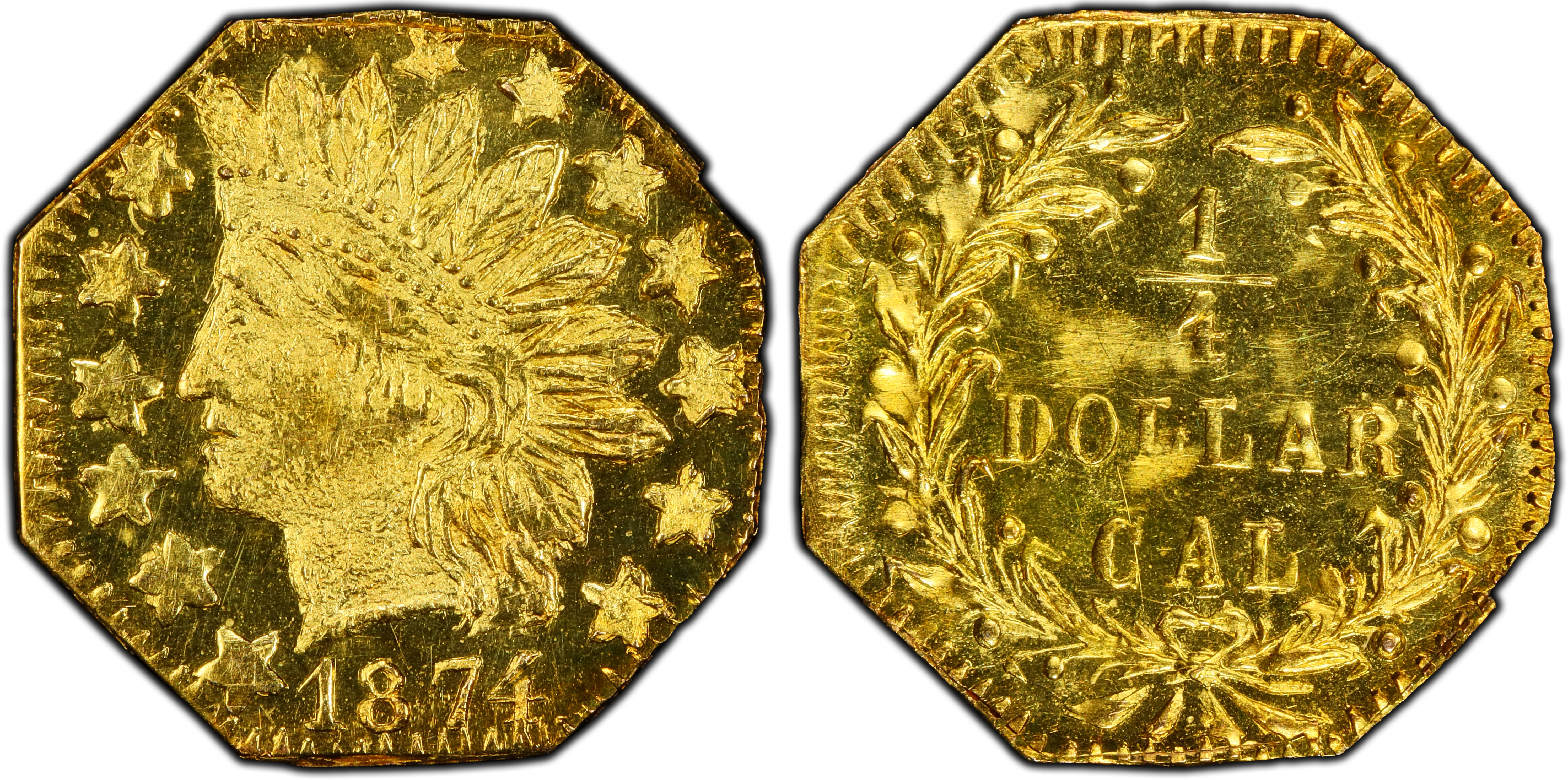 The 1874 25 Cent octagonal gold piece, cataloged as Breen-Gillio 795, is a quintessential example of a 'Period Two' California Fractional Gold coin. This era, spanning from 1858 to 1882, represents a significant evolution from the earlier 'Period One' issues. The initial fractional gold pieces of 1852-1857 were born of necessity, created by private jewelers and metallurgists to alleviate a severe shortage of small-denomination coinage that plagued the booming Gold Rush economy. These first issues were generally of good weight and were intended to, and did, facilitate commerce. By the 1870s, the landscape had changed. The San Francisco Mint, opened in 1854, was in full production, and federal silver and minor coinage had largely saturated the region, eliminating the acute need for private issues. Consequently, the motivation for producing fractional gold shifted from utility to novelty. The BG-795 was created not for the miner's pouch but for the tourist's pocket or the lady's jewelry box. These 'jeweler's issues' were primarily souvenirs, tangible mementos of the romanticized Gold Rush era sold in San Francisco's shops. As such, their gold content was often significantly less than their face value would imply; many were thinly struck, debased with other metals, or even merely gold-plated. The Coinage Act of 1864 had explicitly outlawed private coinage, but enforcement by the Secret Service was lax in California until the early 1880s, allowing this cottage industry to persist. Many Period Two minters were anonymous, leaving behind no identifying marks, earning their creations the numismatic moniker 'mavericks.' The BG-795 falls into this category, its maker lost to history. Its existence is a testament to the enduring allure of the gold fields and the clever marketing of jewelers who capitalized on it, creating a fascinating and complex series for future numismatists.