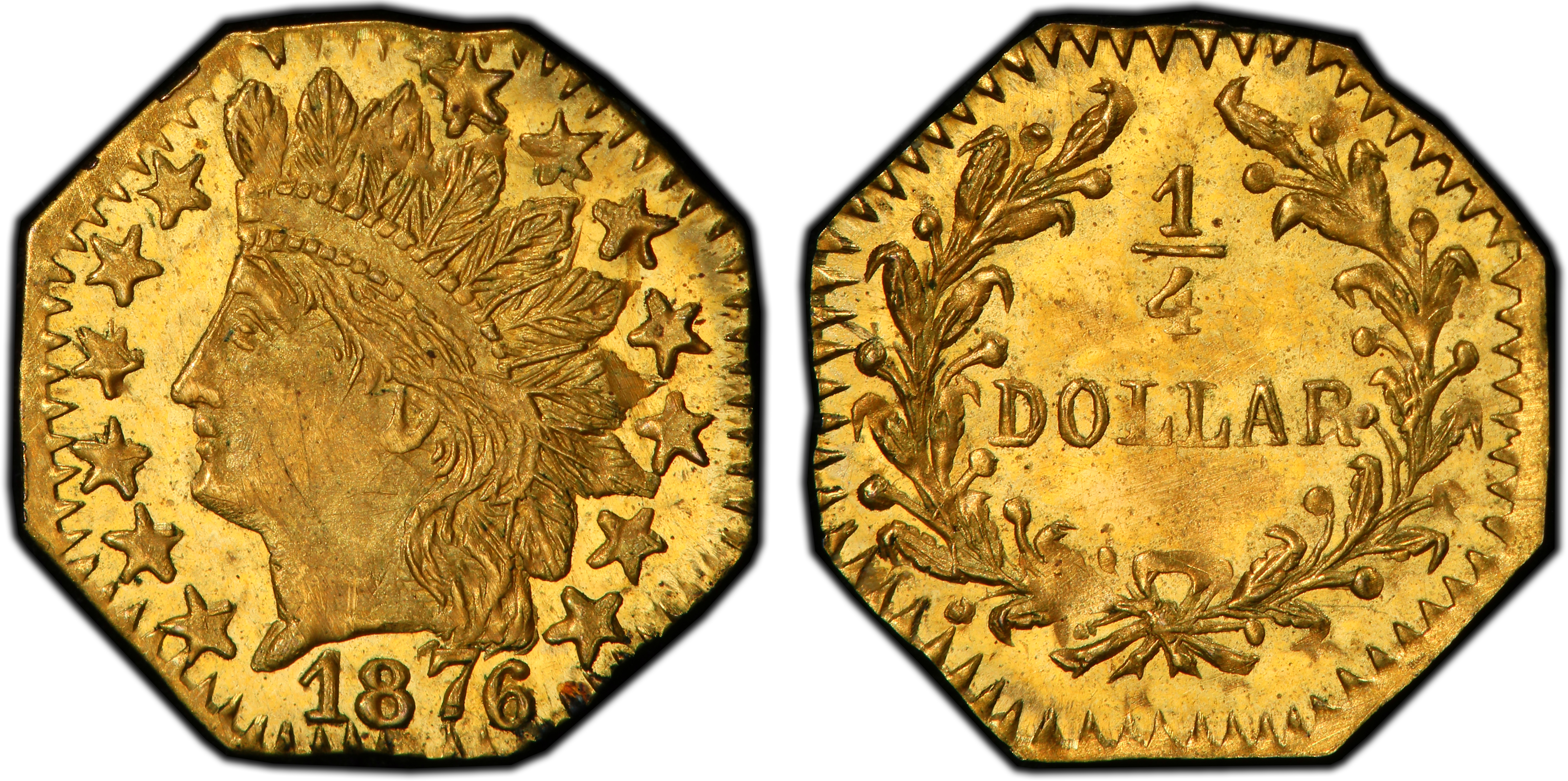 The 1876 BG-799F 25 cent piece emerges from the second major phase of California's private gold coinage, known to numismatists as 'Period Two' (1859-1882). Unlike the 'Period One' issues, which were struck out of genuine commercial necessity to alleviate a dire shortage of small change during the Gold Rush, the Period Two pieces occupy a more complex, quasi-legal space. The Coinage Act of 1864 had explicitly forbidden private individuals from issuing currency, rendering the manufacture of denominated gold coins a federal crime. However, enforcement in the West was lax, and the public's fascination with the Gold Rush created a booming market for souvenirs and keepsakes. San Francisco jewelers, many of whom remain anonymous, stepped into this market. They produced a dizzying variety of miniature gold 'coins' that were sold as novelties, incorporated into jewelry, or kept as mementos of a visit to the romanticized West. By 1876, the United States was celebrating its Centennial, and Philadelphia was hosting a massive Exposition. This event spurred national pride and interest in American history, likely increasing tourist demand for items like California Fractional Gold. These pieces were not intended to, and largely did not, function as circulating money. Their gold content was often less than their face value would imply, and their tiny size made them impractical for daily commerce. The BG-799F, with its classic 'Indian Head' motif—a design romanticizing the American frontier—was perfectly tailored to this souvenir market. The production of these pieces continued until a Secret Service crackdown in the early 1880s finally extinguished the practice, closing a fascinating chapter of American enterprise and numismatic history. Today, these 'jeweler's issues' are highly collectible, valued not for their intrinsic worth but as tangible artifacts of a transitional period in California's history.
