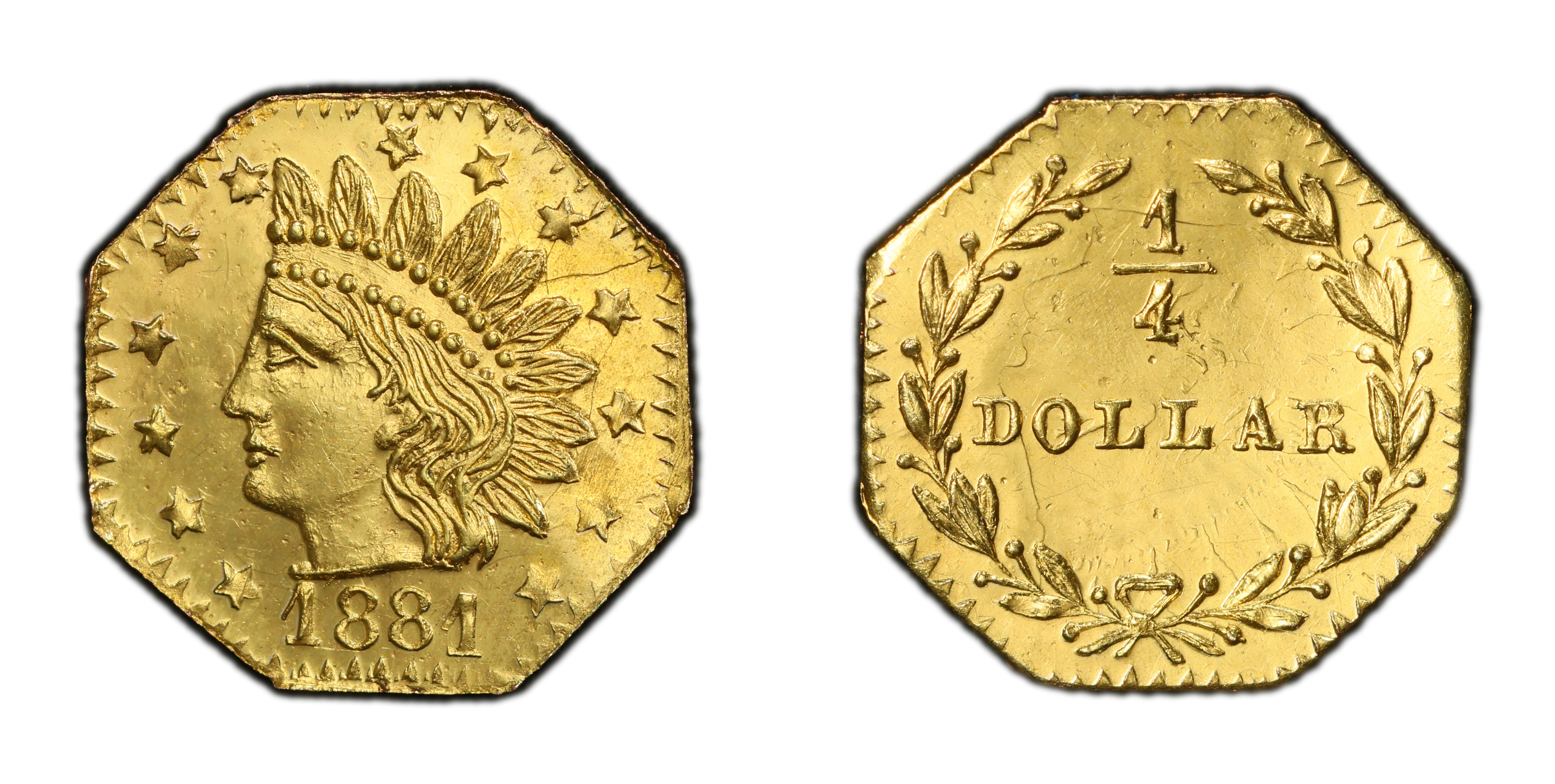 The 1881 25C BG-799BB is a product of the twilight years of California's fascinating fractional gold series. By the 1880s, the initial, desperate need for small circulating coinage that drove the creation of the first 'Cal Fracs' in 1852 had long subsided. The San Francisco Mint was in full operation, and federal coinage was plentiful. The purpose of these later-period 'jeweler's issues' had shifted dramatically from utilitarian currency to souvenirs and novelty items. The romance of the Gold Rush, though decades past, was a powerful marketing tool, and a burgeoning tourist trade in San Francisco created a vibrant market for these miniature gold tokens. Minter Robert B. Gray was a prominent San Francisco manufacturing jeweler who produced a wide variety of these small denomination pieces from the mid-1870s until the early 1880s. Unlike the earlier 'Period One' issues, which contained close to their face value in gold, these 'Period Two' pieces were intentionally underweight tokens. Their value was not in their metallic content but in their appeal as mementos of California's golden legacy. The passage of the Act of April 22, 1864, had made private coinage illegal, but the law was not strictly enforced against these small tokens until a final crackdown in 1883 effectively ended their production. The BG-799BB variety, with its classic Indian Head motif, was a popular design of the era, evoking a uniquely American frontier spirit that appealed to visitors. These pieces were struck using the traditional hammer method, where dies were struck by hand, leading to significant variations in strike quality and centering, a characteristic feature of the series.