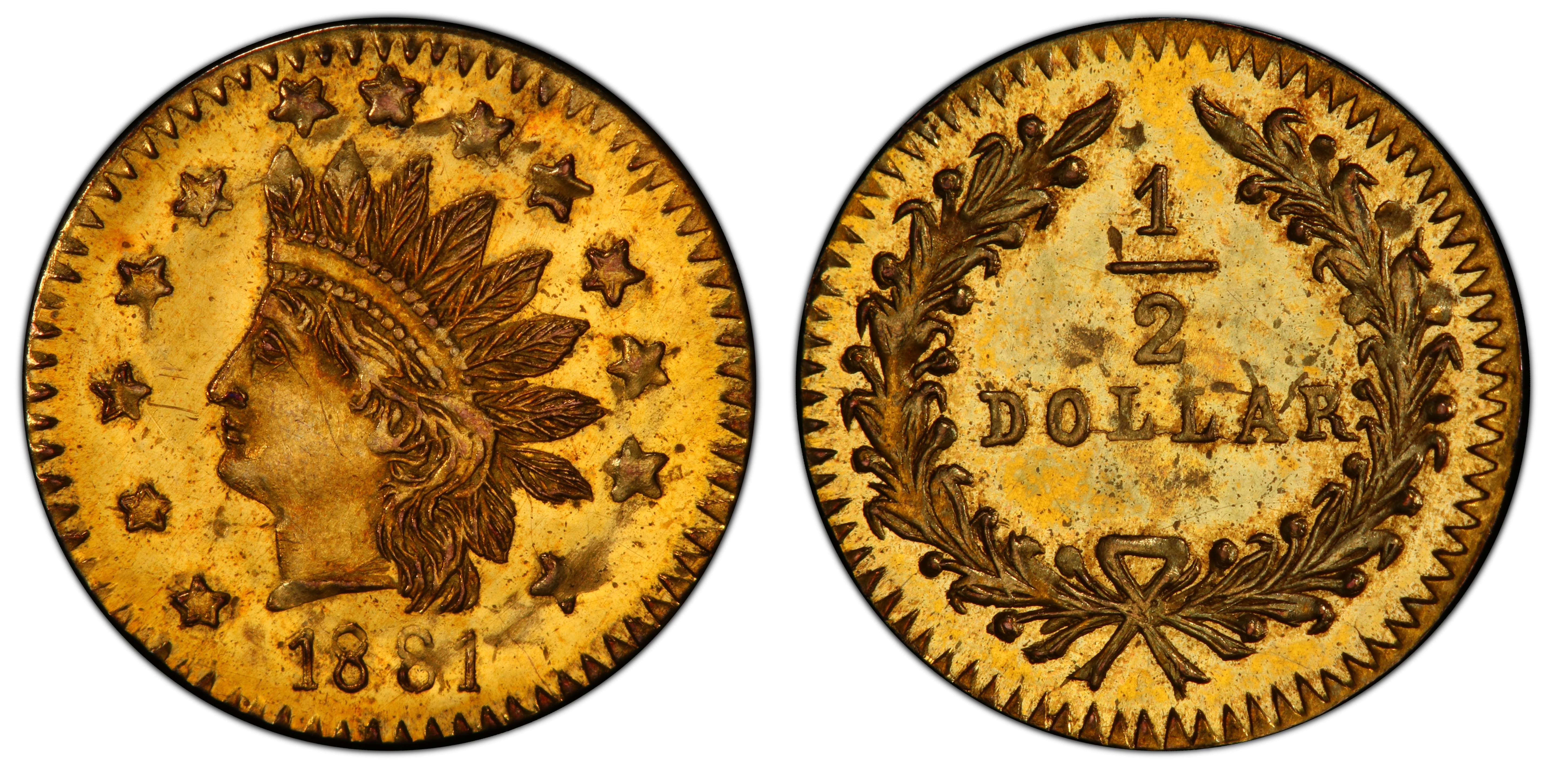 The 1881 BG-1070 50 Cents is a quintessential example of a 'Period Two' California Fractional Gold piece, a fascinating and complex series born from the aftermath of the California Gold Rush. The initial wave of fractional gold (Period One, 1852-1856) was struck out of a genuine commercial need to supplement the lack of small change in the gold fields. However, by the late 1850s, the San Francisco Mint was producing sufficient federal coinage, rendering the private issues largely obsolete for circulation. Production ceased, only to resume unexpectedly in 1859, ushering in Period Two (1859-1882). This new generation of fractional gold served a different purpose. San Francisco had transformed from a chaotic boomtown into a burgeoning metropolis and a popular tourist destination. Enterprising jewelers and minting firms, many of whom remain anonymous, recognized a lucrative market for gold souvenirs. These small-denomination gold pieces were novel, easily transportable mementos of the Gold Rush era. The BG-1070, dated 1881, was struck near the end of this period. Unlike their Period One predecessors, these 'jeweler's issues' were not intended to meet a specific weight or fineness standard and were almost always intrinsically worth less than their face value. Their creation was a commercial venture, catering to tourists and collectors. This era was also marked by increasing pressure from the federal government. The U.S. Secret Service viewed the private minting of denominated coins as a violation of federal law and began to investigate and shut down manufacturers. This pressure intensified, and by 1883, it culminated in a crackdown that forced producers to either cease operations or switch to non-denominated tokens, marking the end of Period Two. The BG-1070 is therefore a relic from the twilight of legal, private denominated coinage in America, representing the transition of fractional gold from a circulating medium of necessity to a cherished collectible souvenir.
