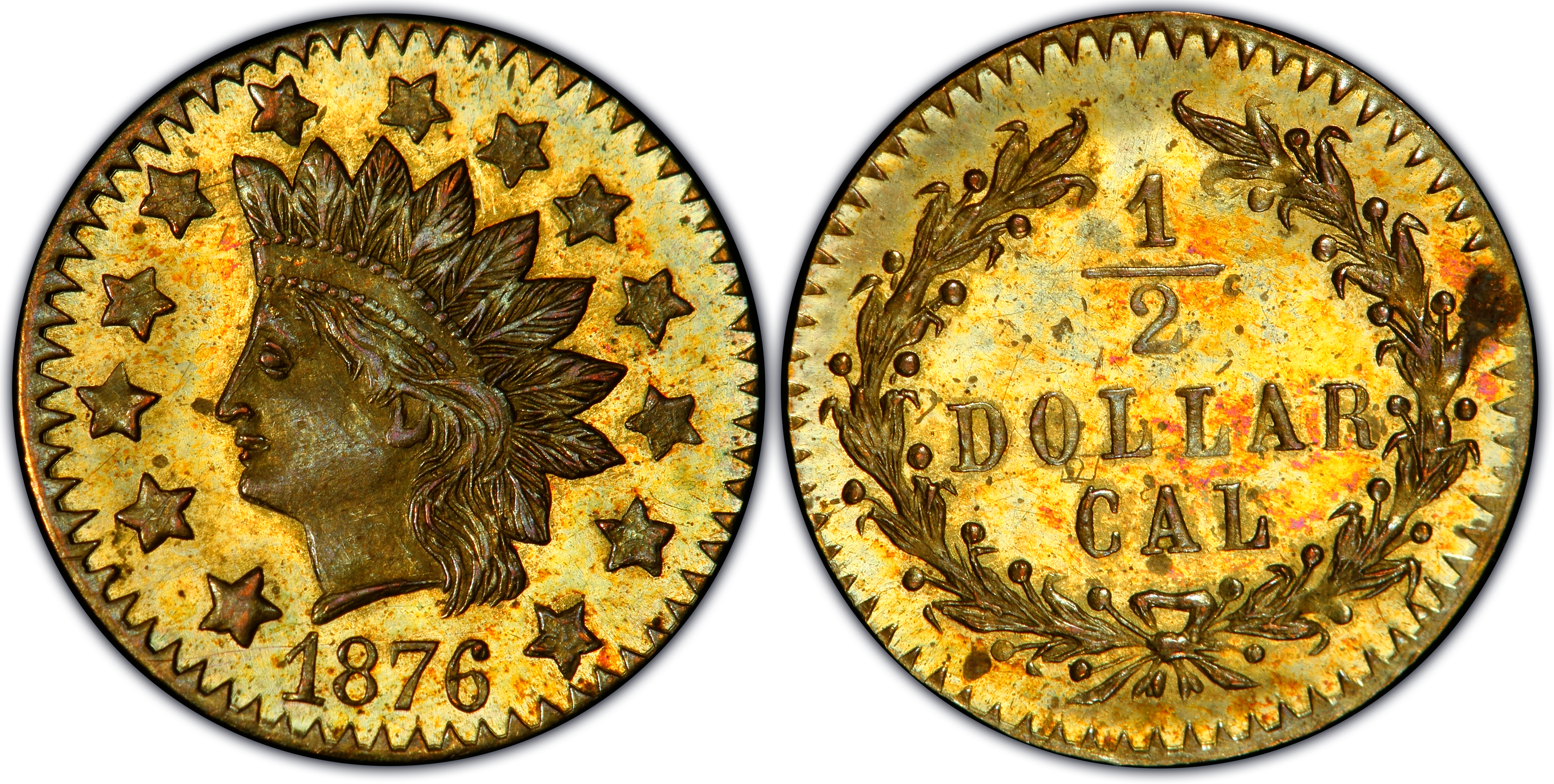 This variety is highly sought after due to its attractive 'Indian Head' design, its status as a dated issue from the Centennial year, and its relative scarcity (R-6). It appeals to collectors of California Fractional Gold, territorial issues, and those fascinated by the post-Gold Rush era. The miniature size and intricate detail make it a classic example of the popular 'Cal Gold' series.