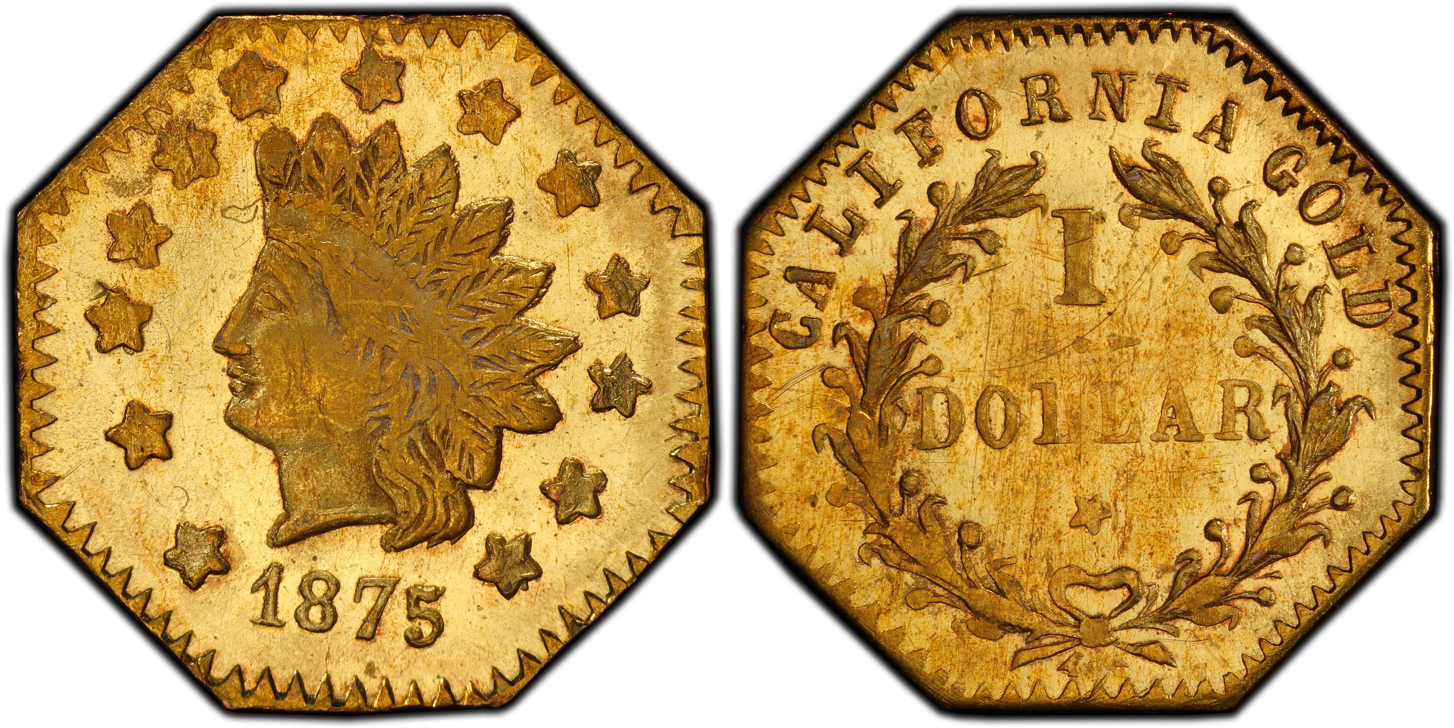 The 1875 BG-1127 octagonal gold dollar is a quintessential artifact of 'Period Two' of California's fascinating fractional gold series. By the mid-1870s, the initial, desperate need for circulating coinage that defined the Gold Rush's peak had subsided with the full-scale operation of the San Francisco Mint. The character of fractional gold production had fundamentally changed. The earlier 'Period One' issues (1852-1856) were struck by necessity and, while private, often attempted to conform to federal standards of weight and value. In contrast, the Period Two issues, including this 1875 piece, were primarily the work of jewelers and merchants responding to a different market demand. These pieces were often significantly underweight for their stated value, functioning more as profitable tokens or souvenirs than as true coinage meant to supplement the federal money supply. Minted long after the Coinage Act of 1864 explicitly forbade private currency, these 'jeweler's issues' operated in a legal gray area, often tolerated locally and eagerly purchased by a public still enamored with the allure of California gold. The BG-1127 was created in a San Francisco transformed from a chaotic boomtown into a sophisticated metropolis, yet one that still celebrated its gold-born identity. These small, intricate gold pieces served as affordable mementos, convenient for small transactions where federal silver was scarce or cumbersome, and as popular gifts. Their production was typically accomplished via the 'hammer strike' method, where dies were struck manually, resulting in considerable variation in strike quality from piece to piece. The anonymous nature of the minter is characteristic of this period, as jewelers sought to profit from the continued demand without attracting federal scrutiny. The BG-1127, therefore, represents not the monetary necessity of 1849, but the commercial ingenuity and romanticism of a maturing California, a tangible link to the enduring legacy of the Gold Rush.
