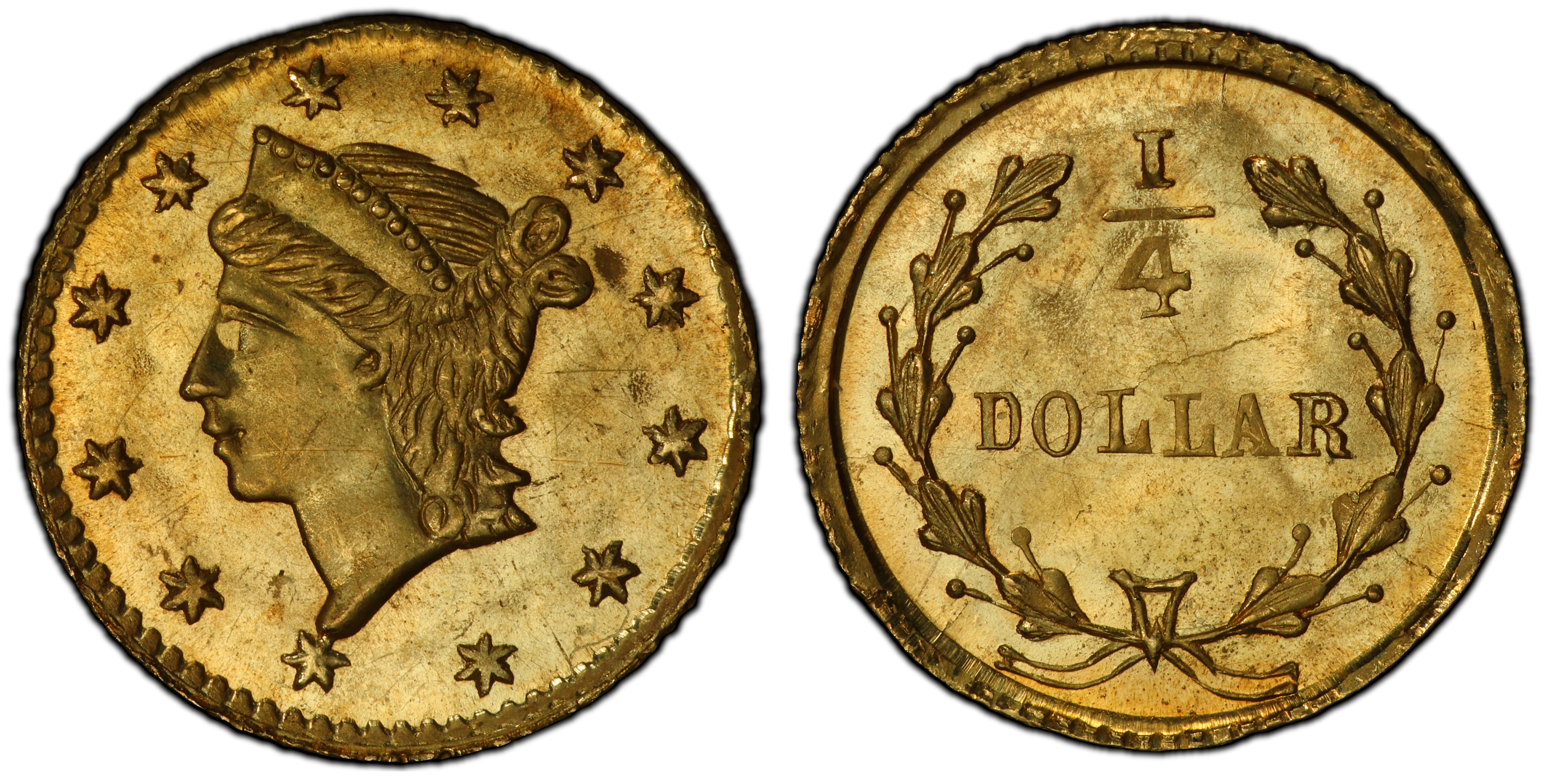 Mint State CharacteristicsAn uncirculated (MS) BG-224 typically displays a soft, satiny luster consistent with Period One fractionals. The strike is often somewhat uneven; it is common to see weakness in the central parts of the design, such as Liberty's cheek or the leaves in the wreath, even on high-grade examples. Planchet quality can be crude, sometimes showing adjustment marks or minor striations. Due to the softness of the gold and their method of production and handling, even mint state examples can have small contact marks.