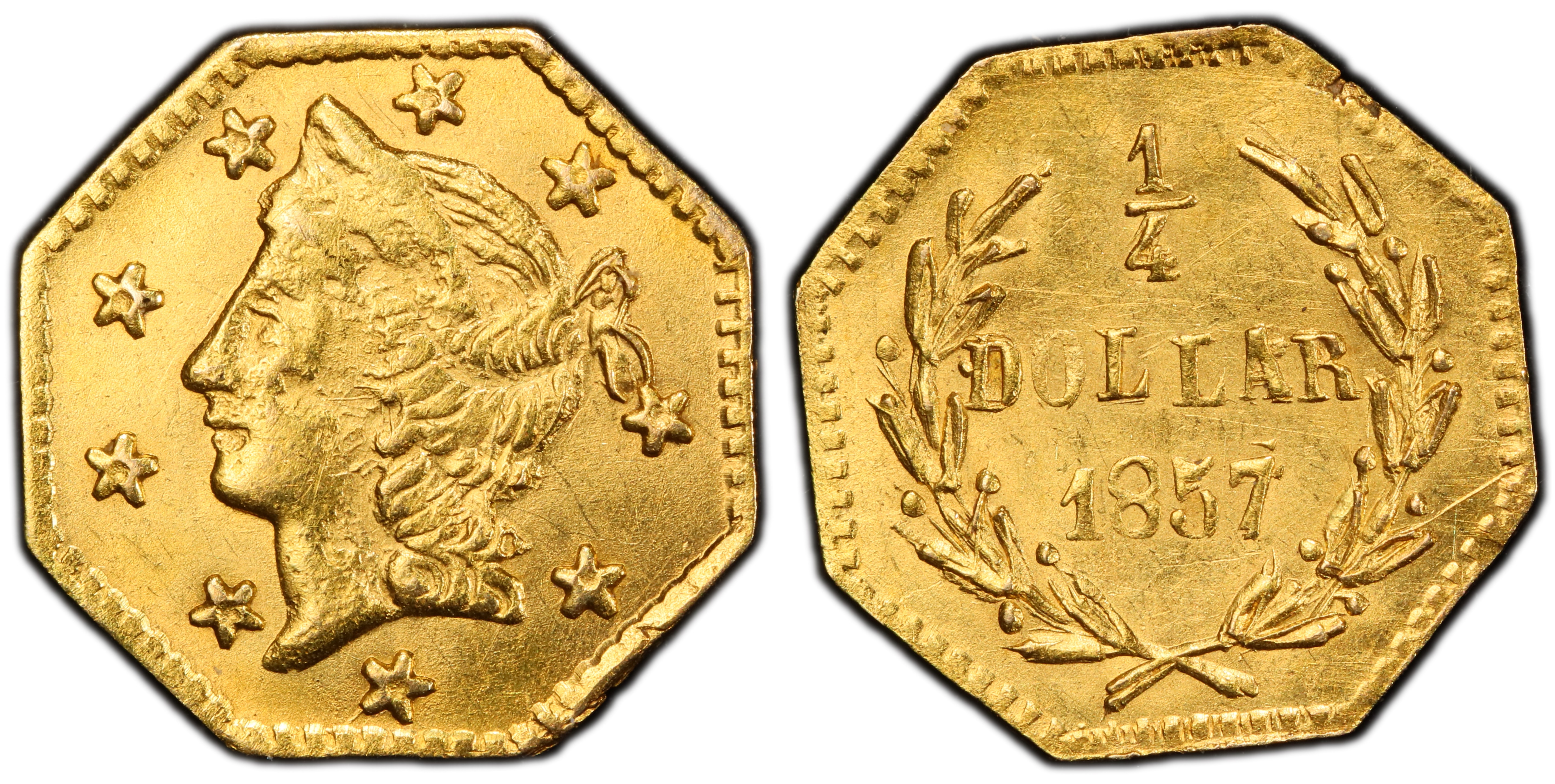 The California Gold Rush, ignited by James Marshall's 1848 discovery at Sutter's Mill, precipitated a massive influx of over 300,000 people to the region, creating a vibrant but chaotic economy. This explosive growth quickly outstripped the available supply of circulating coinage, particularly for small, everyday transactions. A 'pinch' of gold dust, notoriously inconsistent, was a common but problematic medium of exchange. To address this critical shortage, private jewelers and metallurgists in booming cities like San Francisco began striking their own coins in 1852. These 'California Fractional Gold' pieces, denominated as 25 cents, 50 cents, and one dollar, were born of commercial necessity. The BG-1301, an octagonal 25-cent piece dated 1857, belongs to what numismatists classify as 'Period One' (1852-1857). Coins from this era are believed to have genuinely circulated to facilitate trade, unlike many later 'Period Two' (1858-1882) issues which were primarily made as souvenirs. These early pieces were often crudely produced using a hammer-striking method, where dies were struck manually with a sledgehammer, leading to inconsistent strike quality even within the same variety. Though they served a vital economic function, these fractional coins contained significantly less gold than their face value would imply, effectively making them tokens. The opening of the official San Francisco Mint in 1854 began to alleviate the coin shortage, but the privately issued fractionals continued to fill a niche for several years. The Coinage Act of 1864 officially made private coinage illegal, though the law wasn't strictly enforced in the West until 1883, bringing an end to this fascinating chapter of American numismatic history. Today, the BG-1301 and its contemporaries are prized as tangible links to the freewheeling, entrepreneurial spirit of the Gold Rush.
