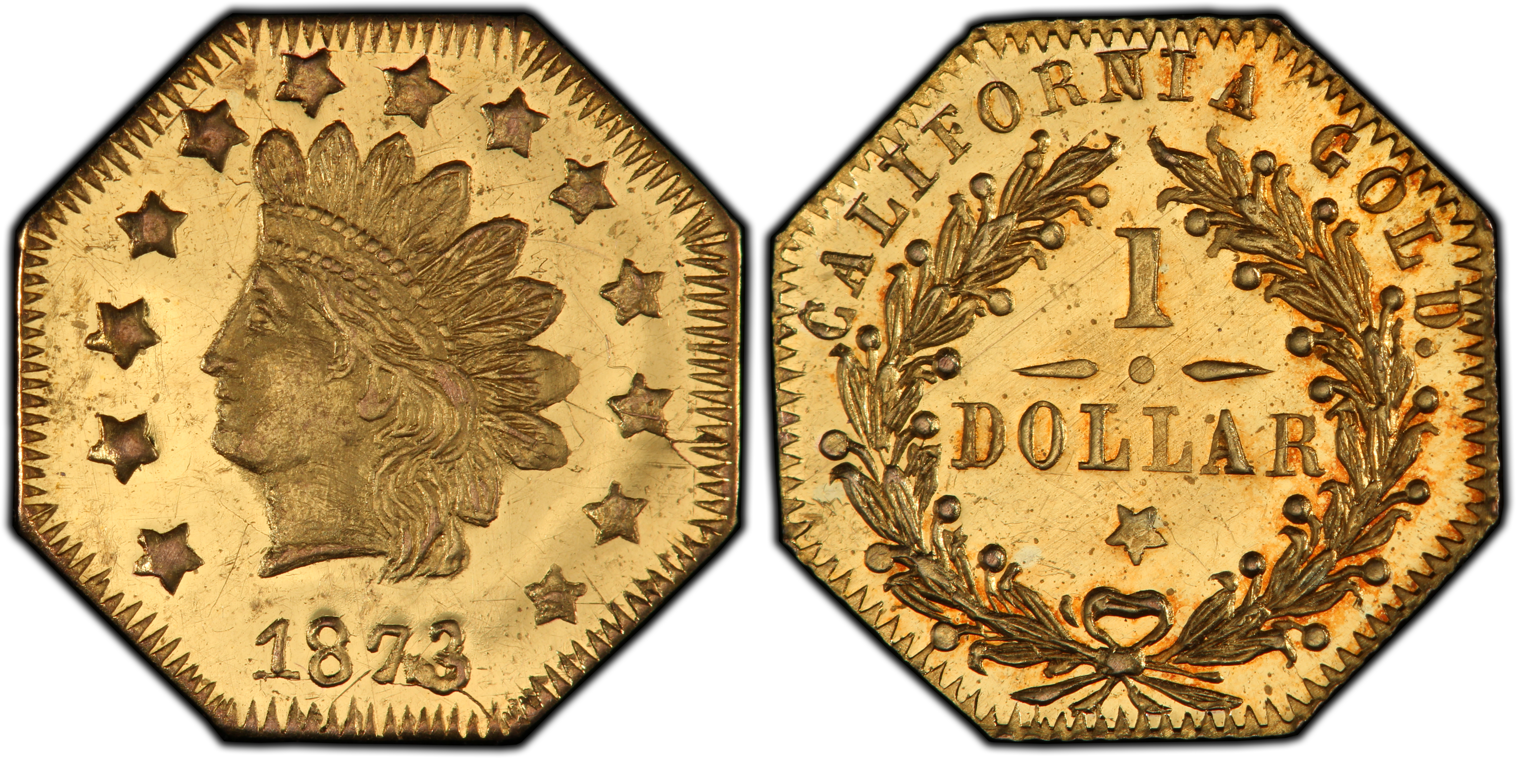 Obverse DescriptionFeatures a stylized Indian Head facing left, a popular motif for the era. The portrait is adorned with a feathered headdress. Thirteen stars, representing the original colonies, encircle the portrait along the octagonal border. The date, 1873, is positioned below the bust and prominently shows a 3 punched over a 2.