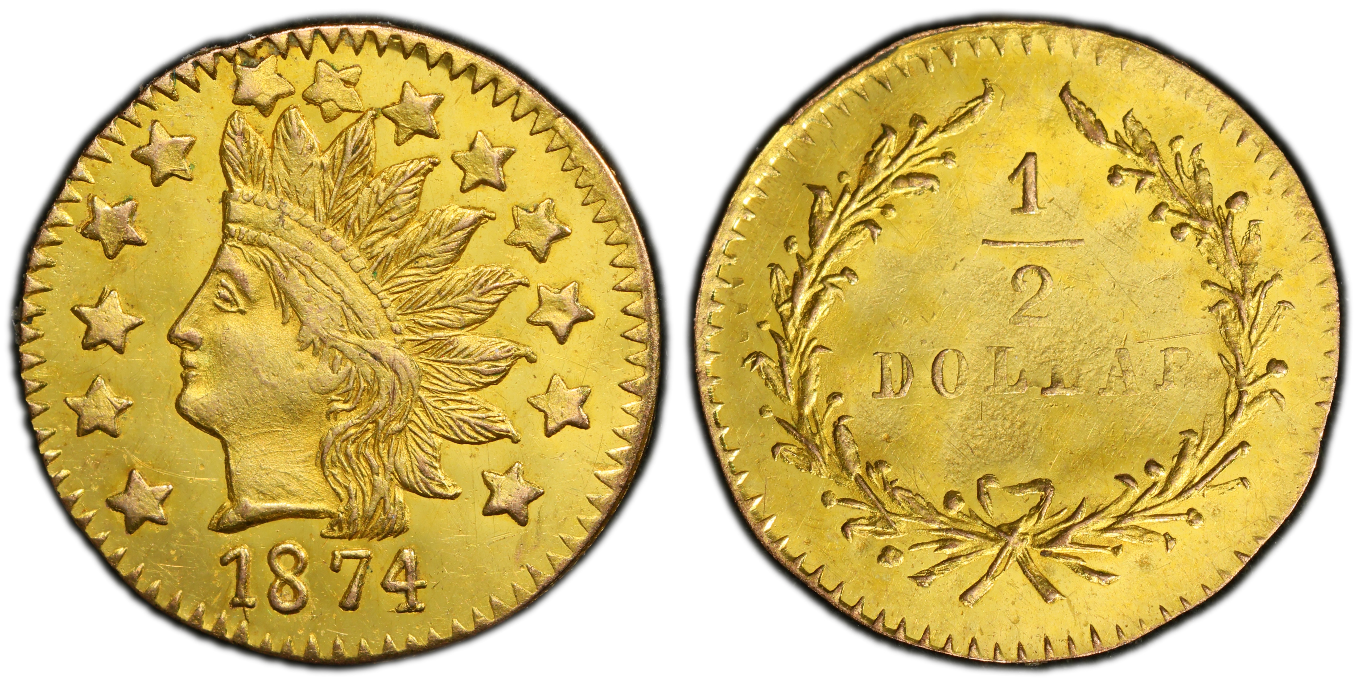 The 1874 G50C BG-1071 is a product of the second great era of California Fractional Gold production, often termed 'Period Two' (1859-1882) by numismatists like Walter Breen and Ronald J. Gillio. Unlike the 'Period One' issues, which were struck out of genuine commercial necessity to alleviate a severe shortage of small change during the initial Gold Rush, these later pieces served a different purpose. By the 1870s, the San Francisco Mint was in full operation, producing ample federal coinage for the region's economy. The acute need for privately-minted fractional gold had subsided. Instead, these small gold pieces evolved into popular souvenirs, keepsakes, and jewelry items for a burgeoning tourist trade and a populace still captivated by the romance of the Gold Rush. The Coinage Act of 1864 had explicitly outlawed private currency, forcing the producers of these 'jeweler's issues' to operate clandestinely. To avoid prosecution, they were often made without a minter's hallmark and frequently backdated, although the 1874 date on this issue appears to be contemporary. These pieces were typically underweight for their face value and varied in fineness, as their purpose was not to function as reliable currency but to be sold as novelties at a handsome profit. The BG-1071, with its Indian Head motif, tapped into the popular 19th-century romanticism of the American West. The extreme rarity of this specific variety today suggests a very small original production, likely struck by a San Francisco jeweler to test a new design or to fulfill a small, private order. Its survival is a tangible link to the post-Gold Rush era of California, a time of economic maturation where the memory of the '49ers was already being commodified and sold as legend.