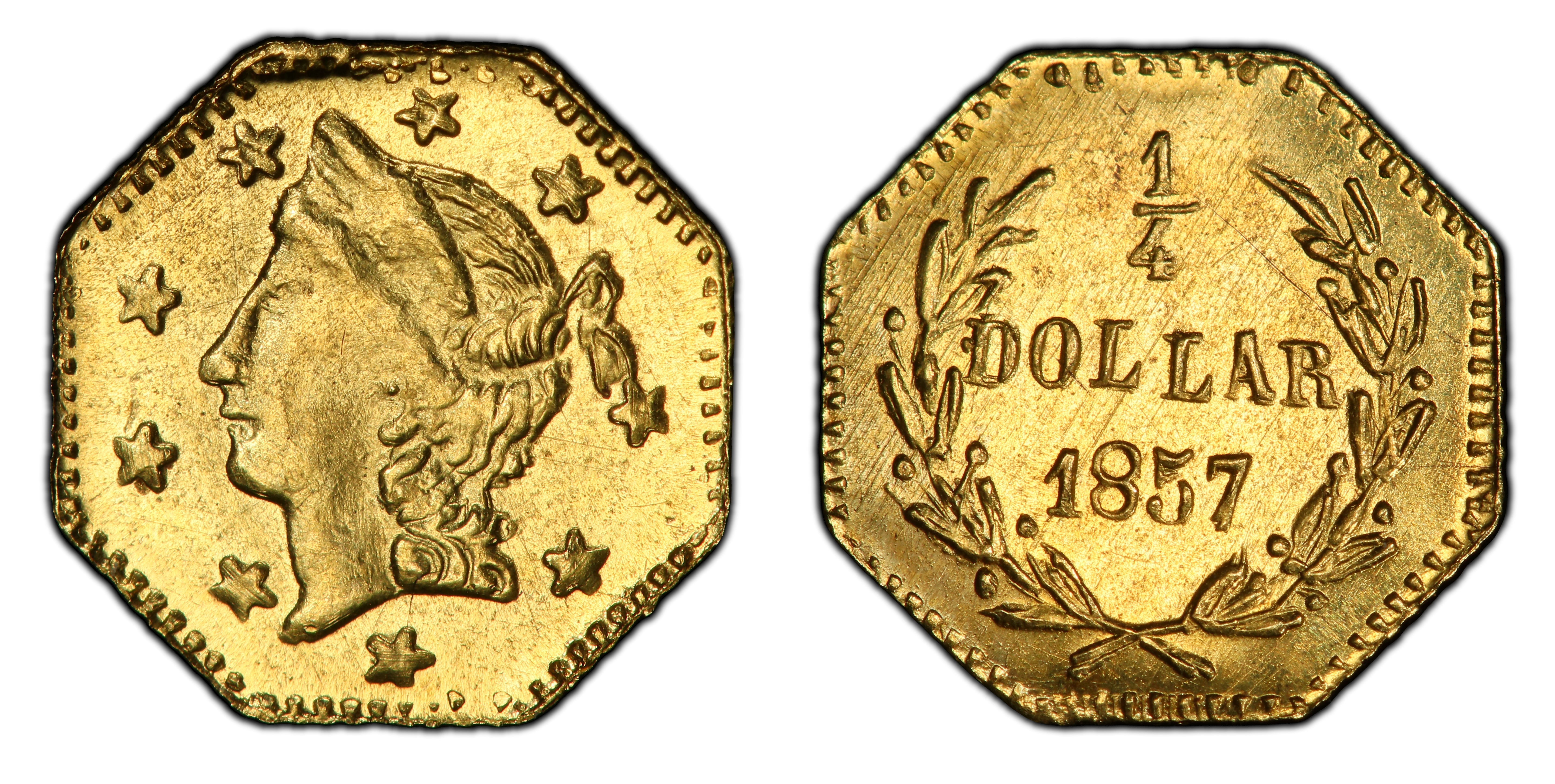 Reverse DescriptionThe reverse features the denomination '1/4' and 'DOLLAR' within a simple wreath. The date '1857' is positioned below the wreath.