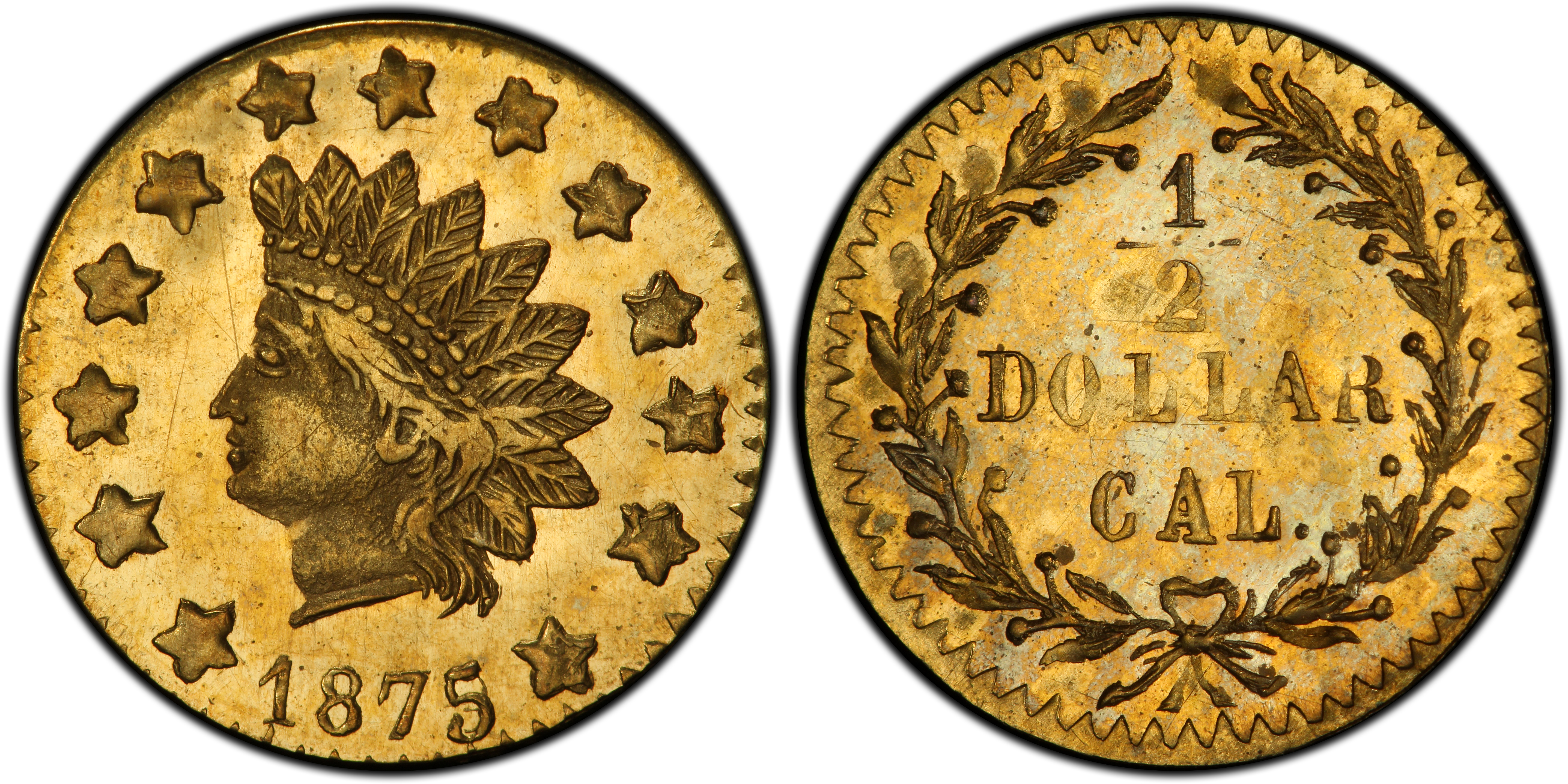 The 1875/3 BG-1058 Fifty Cent piece is a quintessential example of a 'Period Two' California Fractional Gold coin. The history of these fascinating private issues is bifurcated into two distinct eras. 'Period One' (1852-1857) pieces were struck out of genuine commercial necessity. The massive influx of population during the Gold Rush created a vibrant economy, but the United States Mint could not supply enough small denomination coinage for daily transactions. Gold dust was impractical for small purchases, leading private jewelers and assayers in San Francisco to strike their own quarter, half, and one-dollar gold pieces. These early issues, while not legal tender, contained a substantial portion of their face value in gold and were generally accepted in local commerce. However, by 1856-1857, the new San Francisco Mint was in full operation, producing ample federal silver and gold coins, which obviated the need for private fractional currency. This led to the 'Period Two' (1859-1882) issues, to which the BG-1058 belongs. The character of these later pieces changed dramatically; they were no longer intended for circulation but were instead produced as souvenirs, keepsakes, and jewelry items for tourists and locals nostalgic for the Gold Rush days. This specimen, dated 1875, was struck using a die that was altered from an 1873 die, a common practice among private minters to save on costs. As souvenirs, Period Two coins were intentionally made smaller and with less gold content than their face value would imply, making them profitable for their manufacturers and affordable for purchasers. The Coinage Act of 1864 made all private coinage illegal, but it was not strictly enforced against these small tokens until the early 1880s, allowing their production to continue for nearly two decades. The BG-1058, with its popular Indian Head motif, represents the final chapter of this uniquely American series, a tangible link to the romanticism of the California Gold Rush long after its commercial necessity had faded.