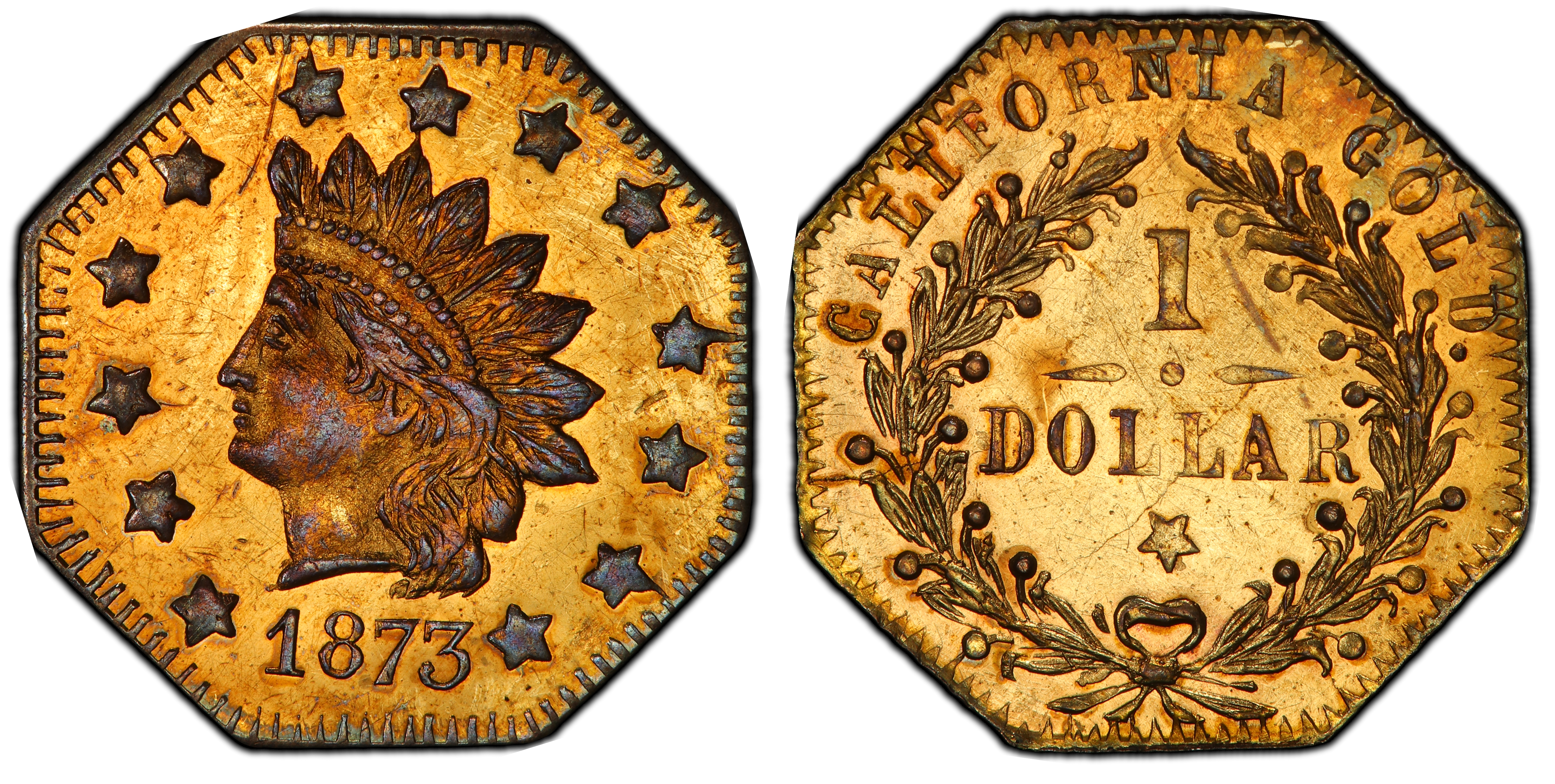 Historical SignificanceThe BG-1123 represents the commercial evolution of private minting in California, from a utilitarian response to a coinage shortage to a market-driven production of nostalgic souvenirs. It is a tangible artifact of the enduring legacy and romanticism of the Gold Rush, demonstrating how the region's gold continued to be monetized in creative ways long after the initial fever had subsided. Numismatically, it is a key variety within the extensive and popular series of California Fractional Gold, prized for its distinct Indian Head design and octagonal shape.