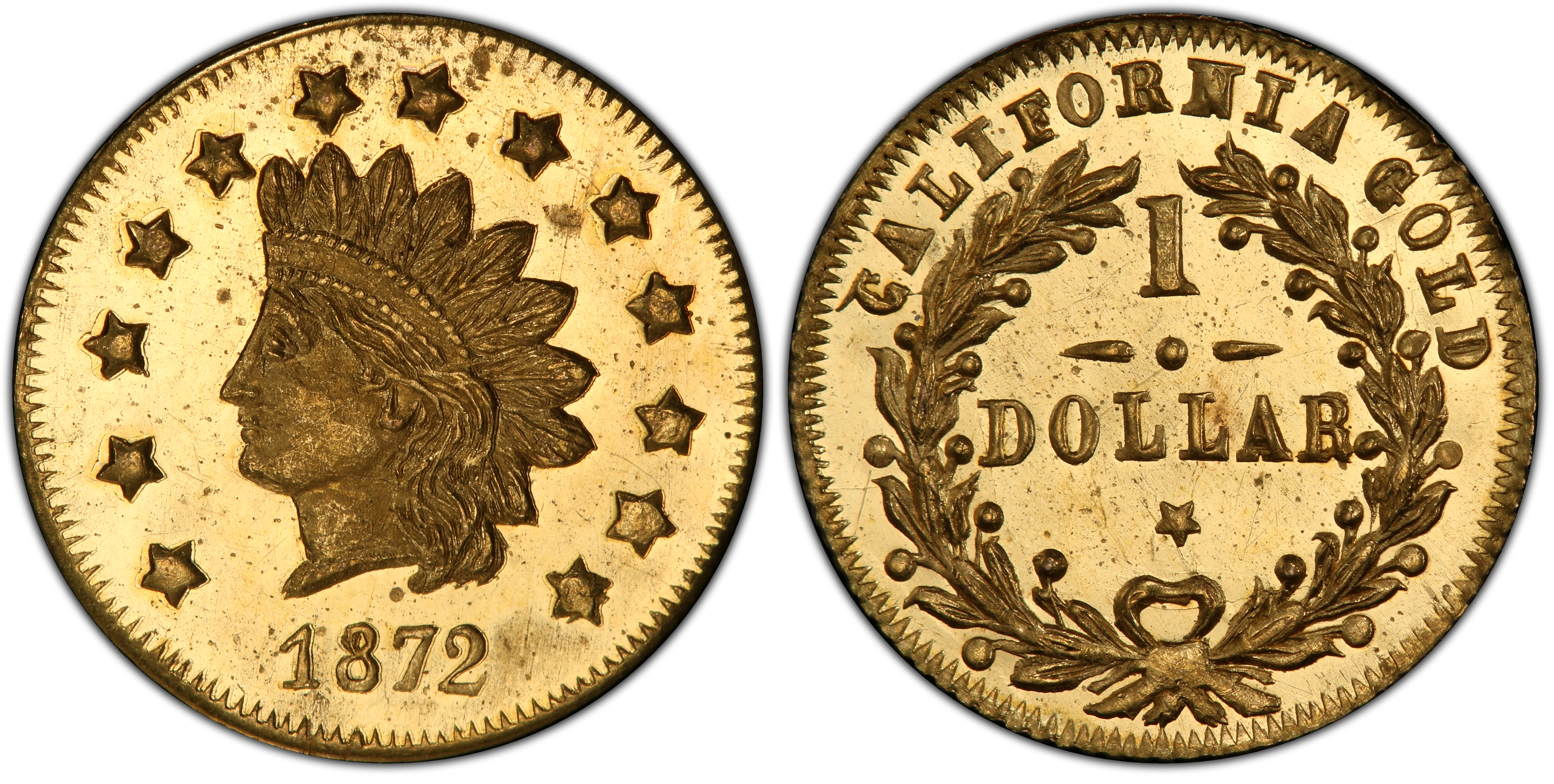 Authentication TipsGenuine examples typically exhibit a somewhat soft, satiny luster, and often show weakness in the strike, particularly on the highest points of the Indian's cheek and the details within the wreath. Counterfeits are common and often have a glassy or unusually prooflike surface, incorrect letter and number fonts (often appearing too thick or 'fat'), and may show raised pimples or tooling marks in the fields. Genuine pieces must have the denomination clearly stated as 'DOLLAR'; pieces with a bear on the reverse or lacking a denomination are modern tokens. All Period Two pieces are underweight compared to federal gold dollars.