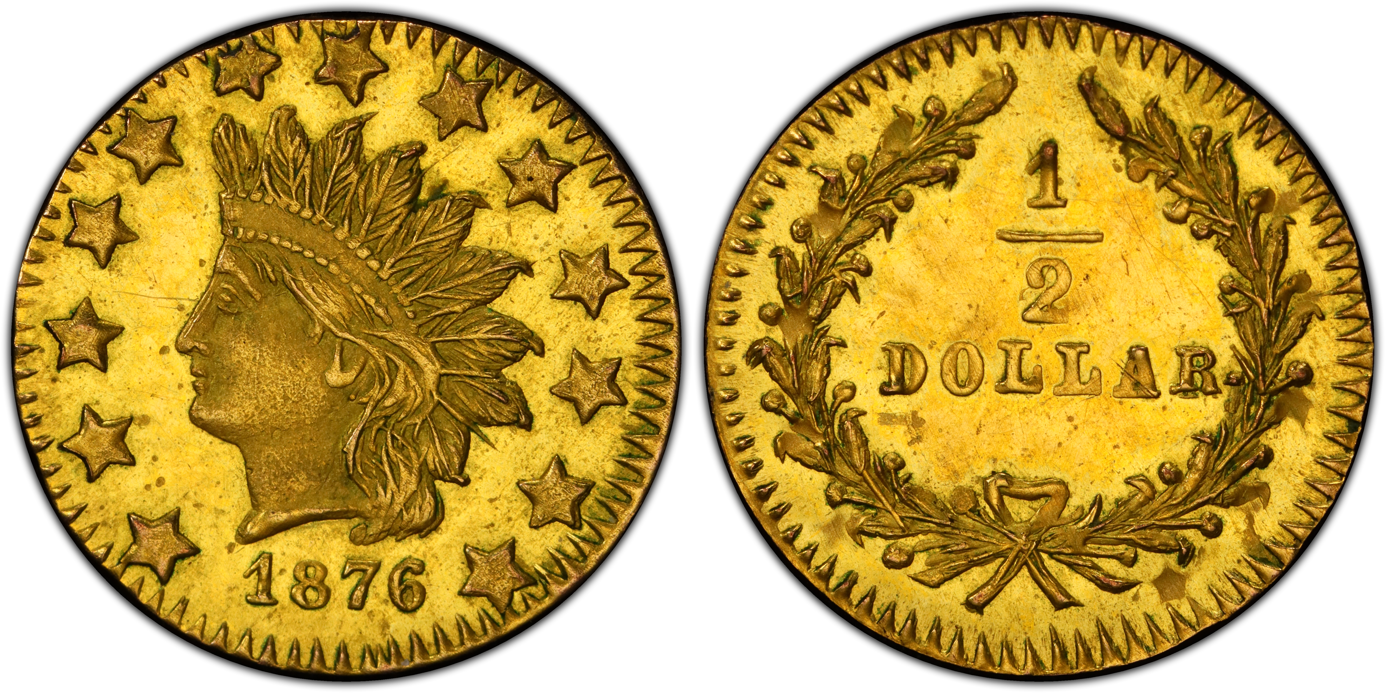 The 1876 BG-1065 50-cent piece emerges from the second great period of California fractional gold production (1858-1882). Unlike the 'Period One' issues (1852-1857), which were struck out of a genuine necessity to alleviate a severe shortage of small-denomination coinage during the Gold Rush, these later 'Period Two' pieces served a different purpose. By the mid-1870s, the United States Mint in San Francisco was in full operation, and the acute need for circulating private gold had subsided. Instead, these miniature gold coins had become popular keepsakes and souvenirs, tangible mementos of the romanticized Gold Rush era. Jewelers in San Francisco capitalized on this demand, producing a wide variety of these small-denomination tokens for tourists and locals alike. The year 1876 was particularly significant as it marked the Centennial of the United States, an event celebrated with great patriotic fervor nationwide, including at the Centennial International Exhibition in Philadelphia. It is plausible that pieces like the BG-1065 were struck to cater to the increased demand for souvenirs during this celebratory year. These Period Two pieces were not intended to, and did not, circulate widely as money. Their gold content was intentionally less than their face value, making them profitable trinkets rather than functional currency. Production of denominated private coinage was officially prohibited by the Coinage Act of 1864, but lax enforcement allowed jewelers to continue minting these 'coins' for nearly two more decades. The Secret Service finally cracked down on these operations in 1883, bringing the era of California fractional gold to a definitive end. Today, varieties like BG-1065 are collected as part of this fascinating and complex series, representing the transition of a utilitarian coinage into a nostalgic collectible.