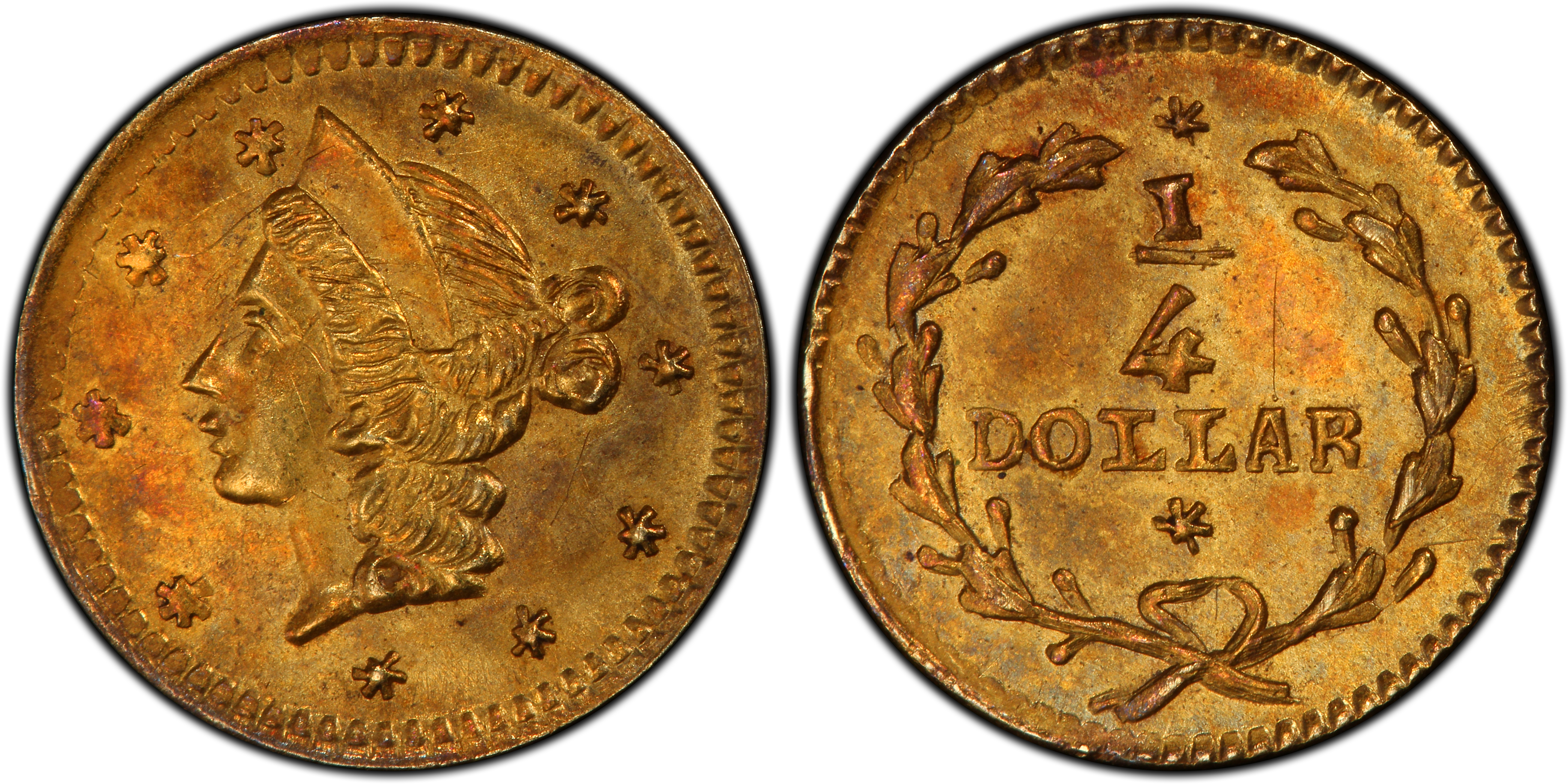 Mint State CharacteristicsAn uncirculated BG-207 will exhibit soft, satiny luster characteristic of the native gold alloy. The strike is almost invariably weak at the borders, with the wreath and stars often appearing soft or incomplete. The high point of the design, Liberty's portrait, should be relatively sharp and free of wear. Due to the rudimentary minting and handling process, small, scattered planchet marks or light adjustment marks are common and may not preclude a Mint State grade if they are not distracting.