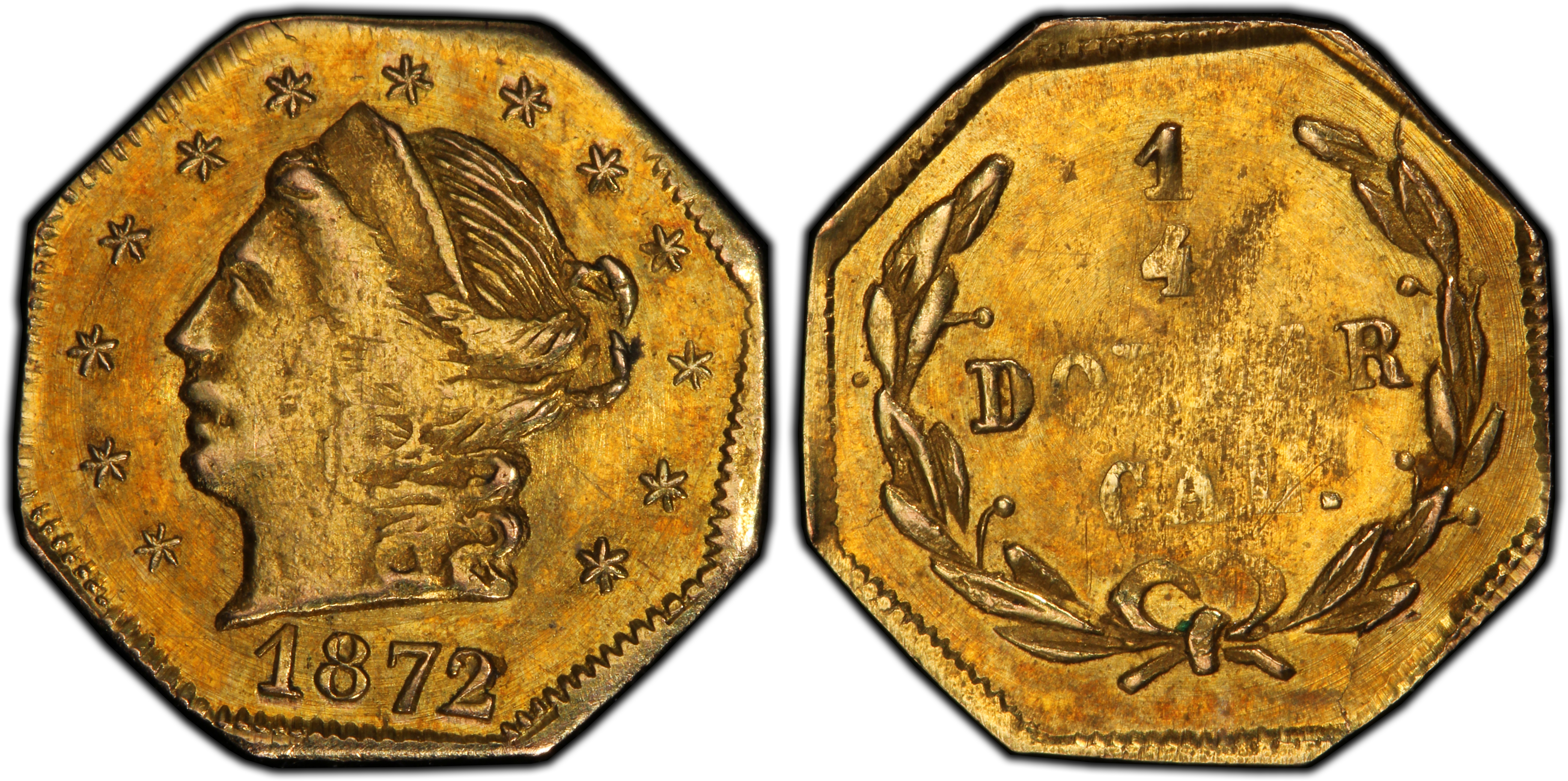 The 1872 25C Octagonal Liberty Head, cataloged as Breen-Gillio 726, is a quintessential example of a 'Period Two' California Fractional Gold piece. By the 1870s, the initial impetus for these miniature gold coins—a severe shortage of small-denomination federal coinage during the Gold Rush—had long since vanished. The San Francisco Mint, established in 1854, was in full production, supplying the region with ample circulating currency. Consequently, the fractional gold pieces of this era transitioned from being items of commercial necessity to objects of novelty and memorabilia. Struck by private jewelers in San Francisco, these tiny gold tokens were marketed primarily as souvenirs for tourists, charms for bracelets, and keepsakes of the romanticized Gold Rush era. Production of fractional gold actually increased in the 1870s, a testament to its popularity as a collectible. Unlike the 'Period One' (1852-1857) issues, which were generally of higher weight and fineness and saw actual circulation, Period Two pieces were often underweight and of lower, variable fineness, as their value was in their novelty, not their intrinsic worth. The Coinage Act of 1864 had made all private coinage illegal, but the law was not strictly enforced against these small souvenir pieces until a crackdown by the Secret Service, led by Chief James J. Brooks, who saw them as a potential for fraud. This enforcement action effectively ended the production of denominated fractional gold by 1883. The BG-726, with its classic Liberty Head design mimicking federal gold coinage, appealed to a sense of national identity and numismatic tradition, making it a popular choice for visitors to the West Coast. Because they were sold as souvenirs and intended for jewelry, a significant portion of the surviving population exists in high grades, often with prooflike surfaces, having never been subjected to the rigors of circulation.