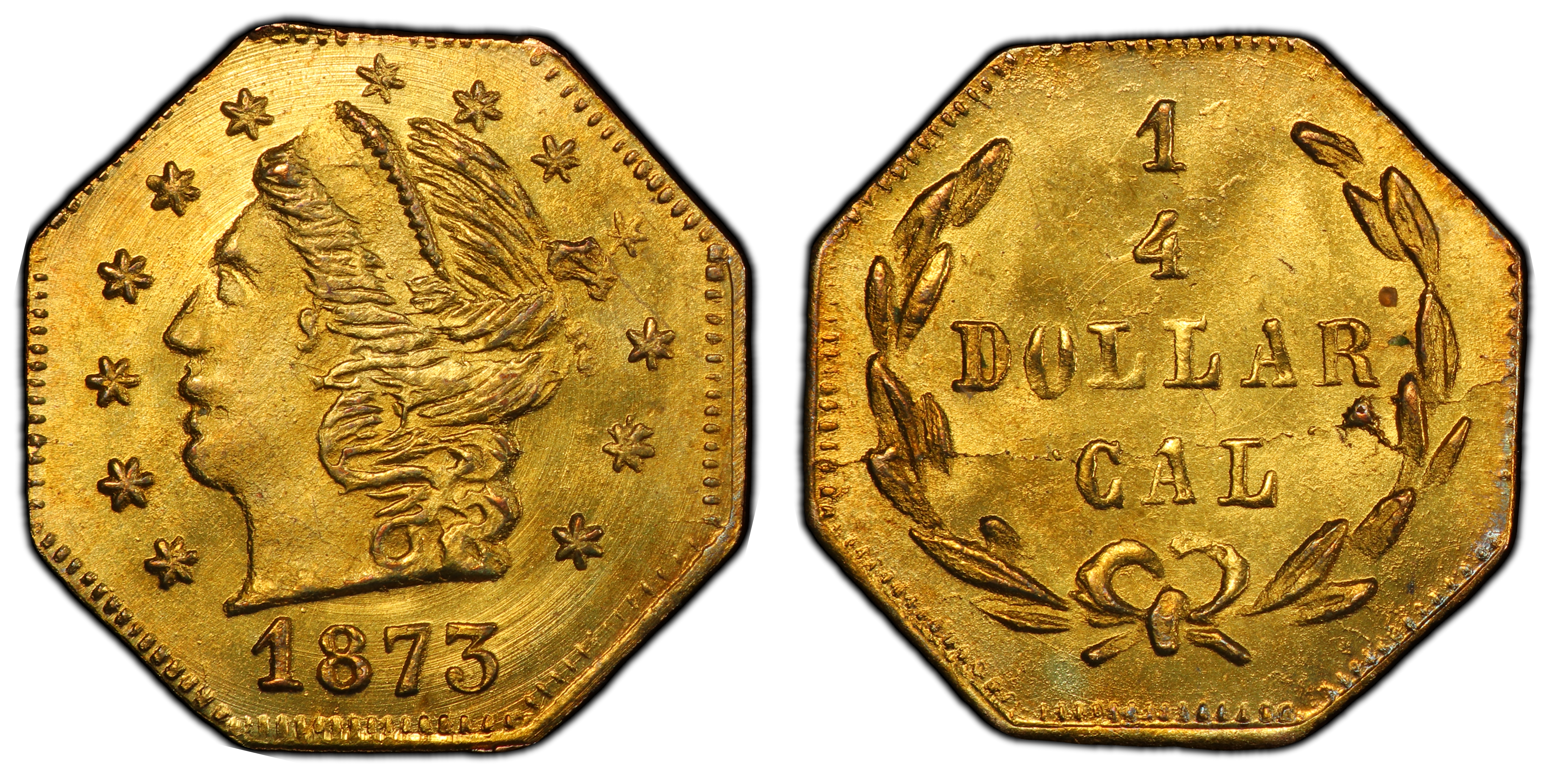 The 1873 G25C BG-727 octagonal 25-cent piece emerged from the third distinct period of California Fractional Gold production (1872-1882). By this era, the initial, desperate need for small denomination coinage that characterized the Gold Rush aftermath had subsided. The United States Mint in San Francisco was fully operational, and federal coinage was more readily available. However, a different market had developed for these miniature gold pieces: the souvenir and jewelry trade. While the earlier issues of the 1850s were intended to, and did, circulate to alleviate a chronic shortage of small change, the pieces from the 1870s and 80s were largely created as mementos of the California Gold Rush. They were popular with tourists and locals alike, often incorporated into rings, pins, and watch fobs. This particular variety, cataloged by Walter Breen and Ron Gillio as BG-727, was struck in 1873. The identity of the specific private minter is lost to history, a common trait for this series, as many were produced by jewelers who operated without prominent mintmarks. These pieces were manufactured in workshops, likely using manual screw presses or even simple hammer-striking methods, which accounts for the variability in strike quality. The legal environment was also precarious; an 1864 federal law prohibited private coinage, but its enforcement against these small, low-value 'tokens' was inconsistent. Many producers circumvented the law by omitting the word 'DOLLAR' or 'DOL,' though this variety explicitly includes 'CENTS.' Despite their primary role as keepsakes, their gold content gave them intrinsic value, and they undoubtedly saw some limited use in small-scale transactions, continuing a uniquely Californian numismatic tradition long after its original purpose had faded.
