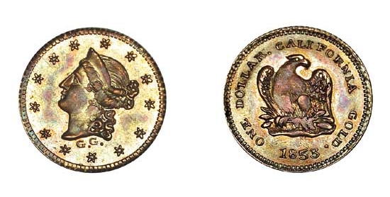 The 1853 G$1 BG-604 'Crested Eagle' stands as one of the most enigmatic and desirable issues within the entire corpus of U.S. private and territorial coinage. It was born of the acute economic necessity that defined California in the early 1850s. The torrent of humanity drawn by the Gold Rush had created a booming economy, yet the supply of official United States small-denomination coinage was hopelessly inadequate for daily commerce. Gold dust, the primary medium of exchange, was imprecise and prone to waste and theft. Into this monetary vacuum stepped a number of enterprising jewelers and metalsmiths, primarily in San Francisco, who began striking their own small-denomination gold coins. These 'Period One' issues, struck from 1852 to 1857, were generally intended for actual circulation and were made with a good-faith effort to contain a reasonable portion of their face value in gold, unlike the later, debased souvenir issues. The BG-604 is a paramount example of this fascinating period. The identity of its creator, known only by the hallmark 'GG' found on the obverse, is lost to history—a common fate for many of these private minters who operated in a legally gray area and often avoided explicit identification. The coin's design, particularly its distinctive 'Crested Eagle' reverse, suggests a die-sinker of considerable skill, setting it apart from cruder contemporary issues. The incredible rarity of the BG-604, with only two or three examples known to survive, suggests an infinitesimally small original mintage. Perhaps the dies failed quickly, or the minter 'GG' produced only a trial run before ceasing operations. Whatever the reason, its scarcity was established from the outset. These coins likely saw limited circulation before being saved as curiosities. Their modern numismatic significance is immense, representing the pinnacle of rarity in a widely collected series. The finest known specimen, graded PCGS MS-62, was a highlight of the legendary Jay Roe Collection, sold by Bowers and Merena in 2003, cementing its status as a world-class numismatic treasure.