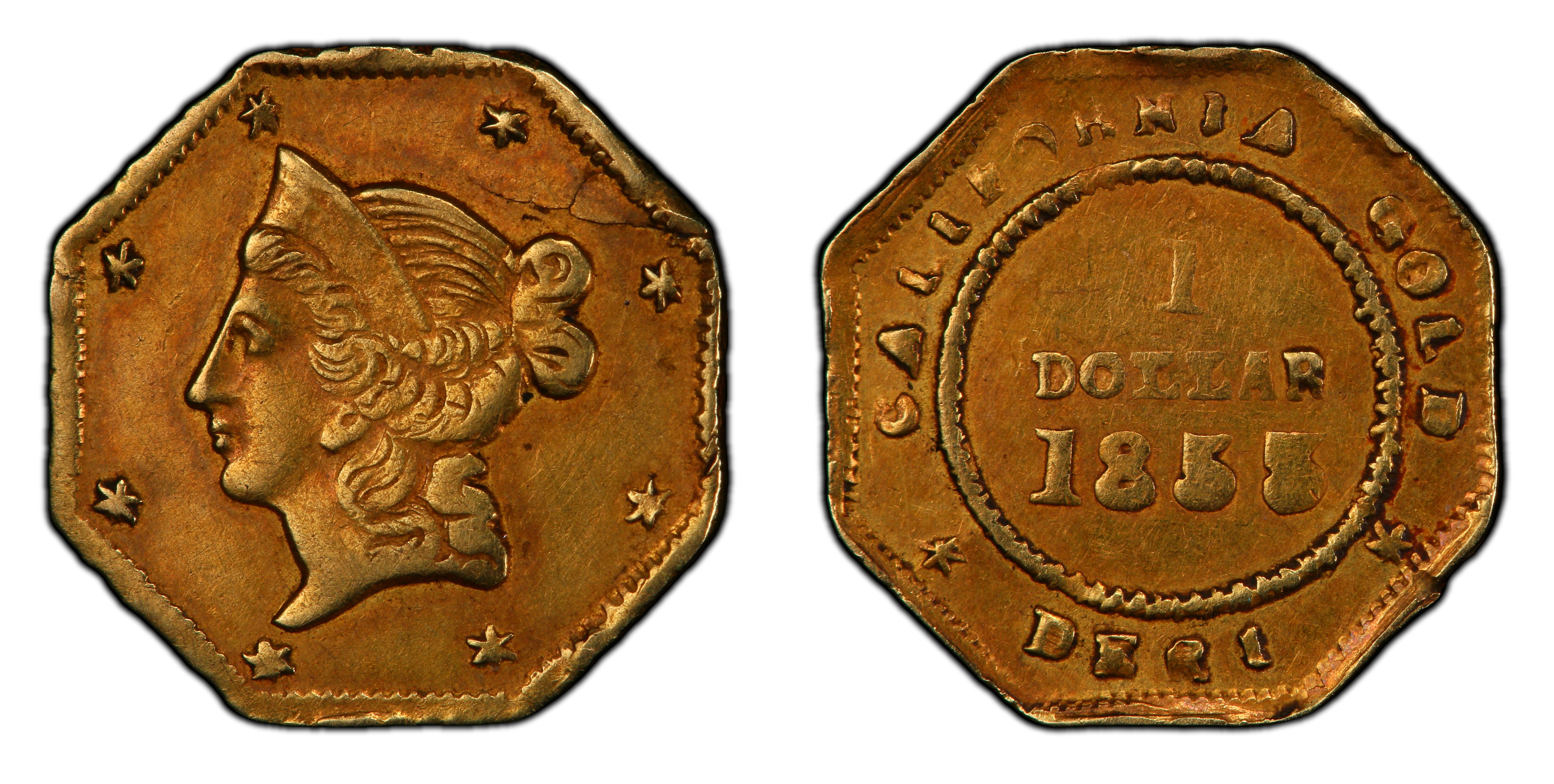 Key VarietiesThis is a 'Regular Strike' from the original minting period (1853), intended for circulation. No major varieties are widely recognized for the BG-521 die marriage itself. It is crucial to distinguish these original issues from later 'Period Two' (1858-1882) souvenir pieces, which were made for the tourist and jewelry trade and are typically smaller, thinner, and of lower gold content. No known proof restrikes or patterns exist for this specific variety.