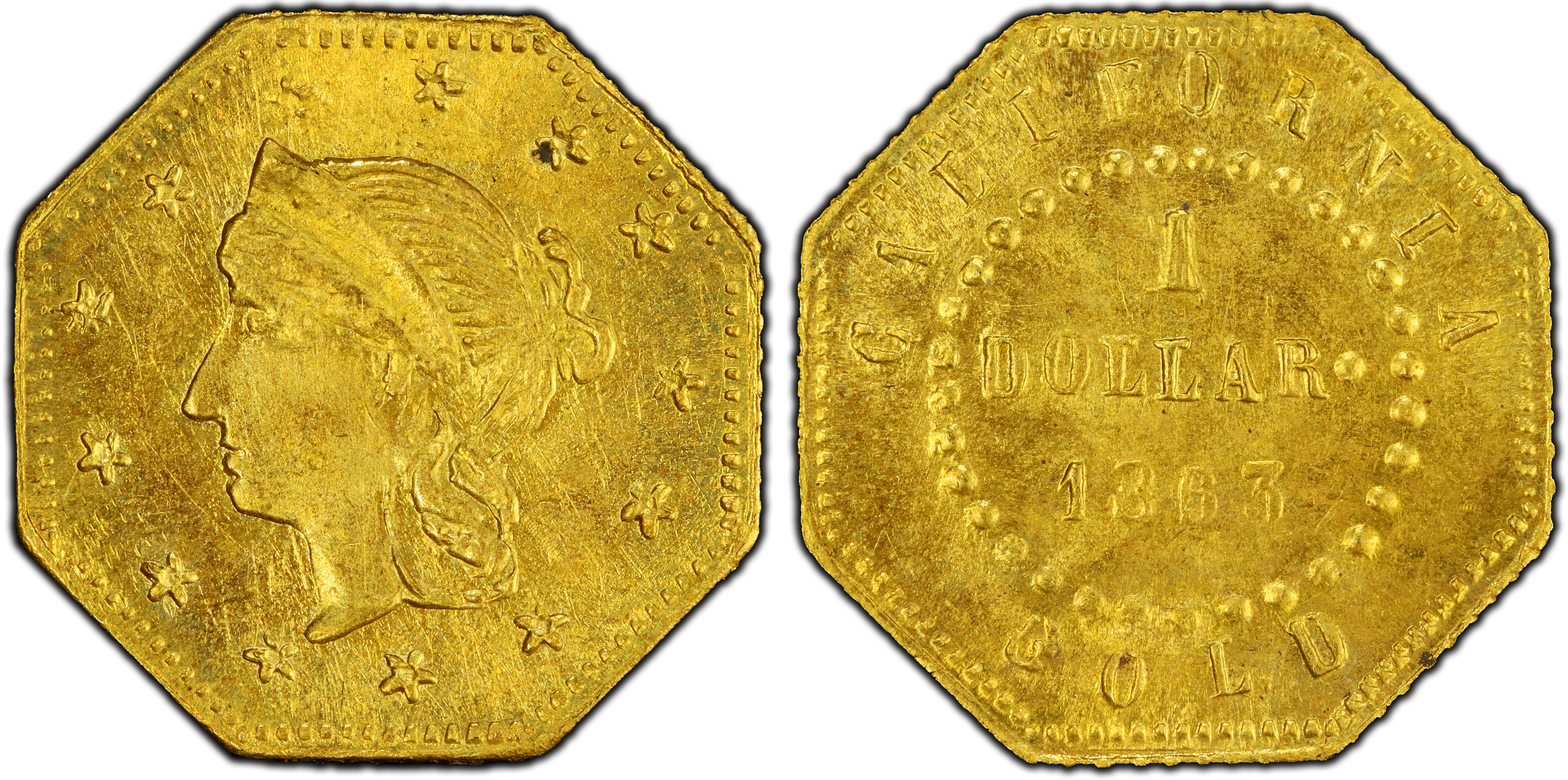 Obverse Inscription Reverse DescriptionThe denomination '1 DOLLAR' and the date '1863' are centrally located within a beaded circle. The legend 'CALIFORNIA GOLD' is arranged in an arc around the periphery, with 'CALIFORNIA' at the top and 'GOLD' at the bottom. The piece is octagonal in shape.