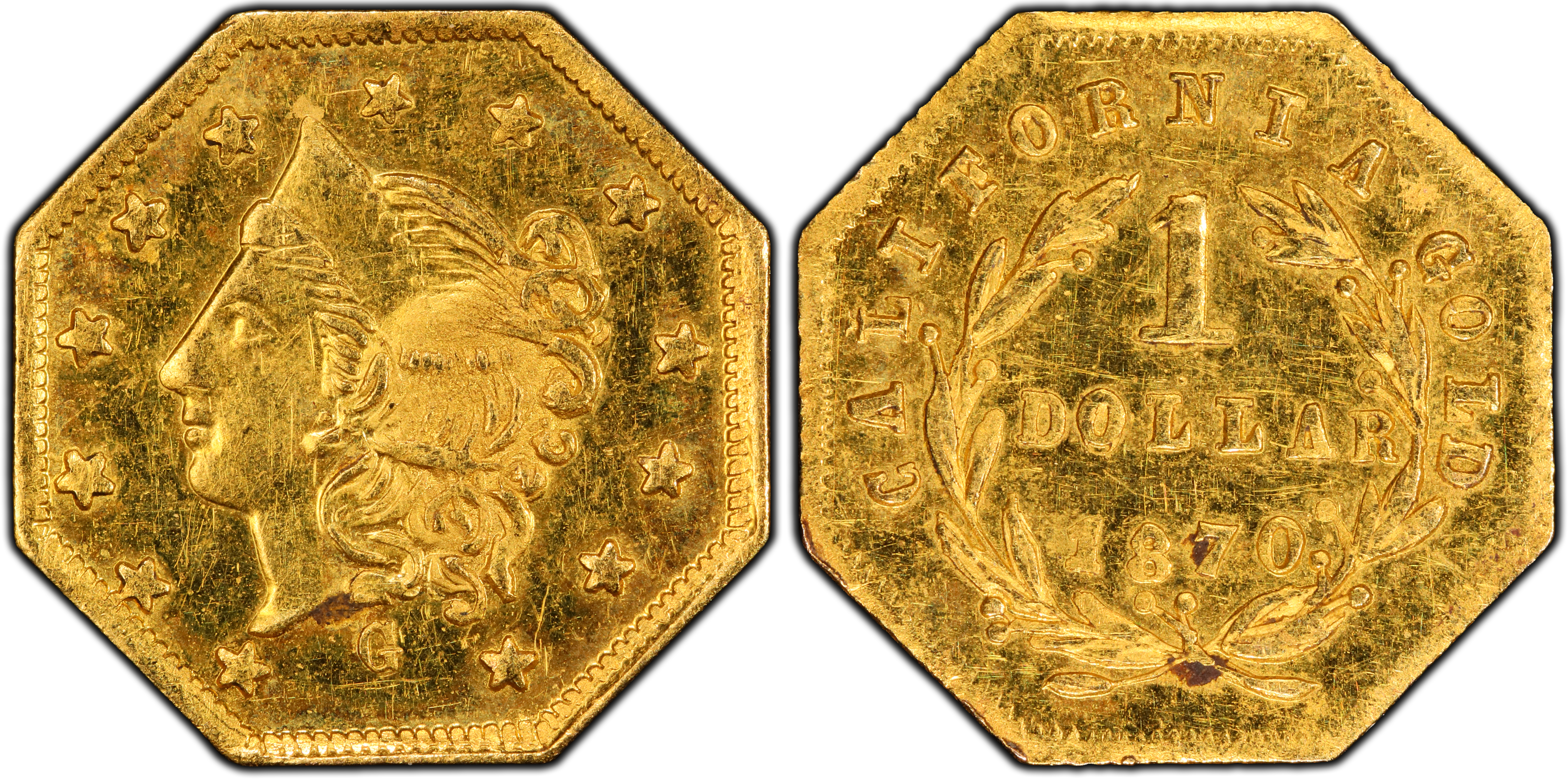 Reverse DescriptionAn octagonal planchet. The denomination '1' and 'DOLLAR' are centered within a wreath of two branches tied by a bow at the bottom. The legend 'CALIFORNIA GOLD' appears above the wreath along the upper facets, and the date '1870' is below the wreath.