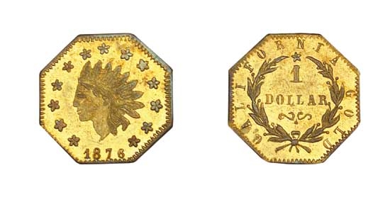The 1876 BG-1116 One Dollar piece is a fascinating artifact from the second period of California Fractional Gold production (1859-1882). Unlike the earlier issues of 1852-1858, which were struck with the genuine intent of alleviating a severe shortage of small change during the initial chaos of the Gold Rush, these later pieces were created primarily as souvenirs and keepsakes. By the mid-1870s, the United States Mint in San Francisco was in full operation, supplying the region with ample federal coinage and rendering private issues for commerce obsolete. However, the romance of the '49ers and the allure of gold had created a robust market for mementos of the Golden State. Jewelers and private minters, many of whom remain anonymous, stepped in to fill this demand. The legal environment for these pieces was precarious. The Private Coinage Act of 1864 had explicitly outlawed the striking of private coins intended for circulation. While enforcement was initially lax, by the 1870s, federal authorities, particularly the Secret Service, began to take a greater interest. This led to a clandestine industry where minters often backdated their creations to pre-1864 dates to avoid prosecution. The fact that the BG-1116 bears a contemporary date of 1876 suggests a certain boldness on the part of its maker, perhaps relying on the piece's status as a 'token' or 'charm' rather than a coin intended to defraud. These 'Period Two' issues were characteristically underweight and their gold content was often less than their face value would imply, further cementing their status as tokens. Struck crudely, often by hand with a hammer, they possess a unique character that is distinct from the more utilitarian, though still primitive, issues of Period One. The BG-1116, with its iconic Indian Head design, appealed to the popular romanticism of the American West and remains a tangible link to the enduring legacy of the Gold Rush, long after the economic necessity for such pieces had vanished.