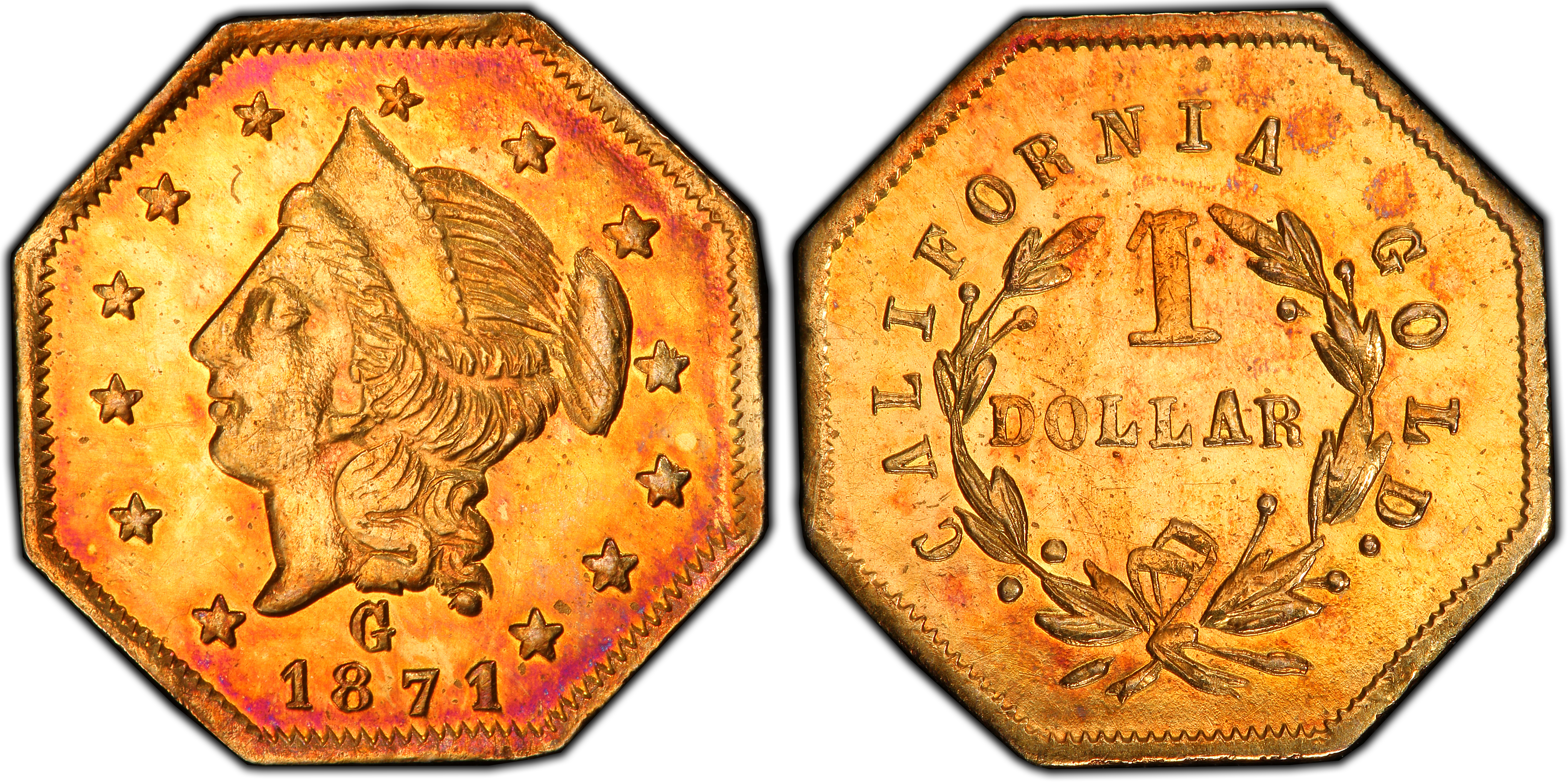 The 1871 G$1 BG-1109 is a quintessential example of a 'Period Two' California Fractional Gold piece. By the 1870s, the acute shortage of small circulating coinage that had plagued California during the initial Gold Rush years had been largely resolved by the output of the San Francisco Mint. The impetus for producing these minuscule gold dollars had shifted from commerce to souvenir sales. These pieces were no longer intended to serve as pocket change but were created as mementos of the romanticized Gold Rush era, eagerly purchased by tourists, merchants, and those sending gifts back to family in the East. This particular variety, designated BG-1109 in the authoritative work by Walter Breen and Ronald J. Gillio, is part of a series struck by jewelers who recognized this lucrative market. Unlike the earlier 'Period One' issues (1852-1857), which were generally of honest weight and intended for circulation, Period Two pieces were notoriously underweight and often of a lower fineness, maximizing the profit for their makers. The 'G' mark is attributed to Robert B. Gray & Co., a prominent San Francisco jeweler who had been active in producing fractional gold. However, historical records indicate that Gray sold his interests to the California Jewelry Co. (who used an 'L' mintmark) in 1871. It is highly probable that the California Jewelry Co. continued to use Gray's existing dies in the immediate aftermath of the sale, accounting for the 'G' on an 1871-dated issue. The production of these pieces was a legally gray area; the Private Coinage Act of 1864 had made such minting illegal, but the law was not aggressively enforced against these popular souvenir tokens until the early 1880s. This lax enforcement allowed a cottage industry of jewelers, both in San Francisco and in eastern cities like Philadelphia, to continue production throughout the 1870s. The BG-1109, with its delicate octagonal shape and Liberty Head motif, represents the final chapter of private gold 'coinage,' a fascinating numismatic echo of the great California Gold Rush.