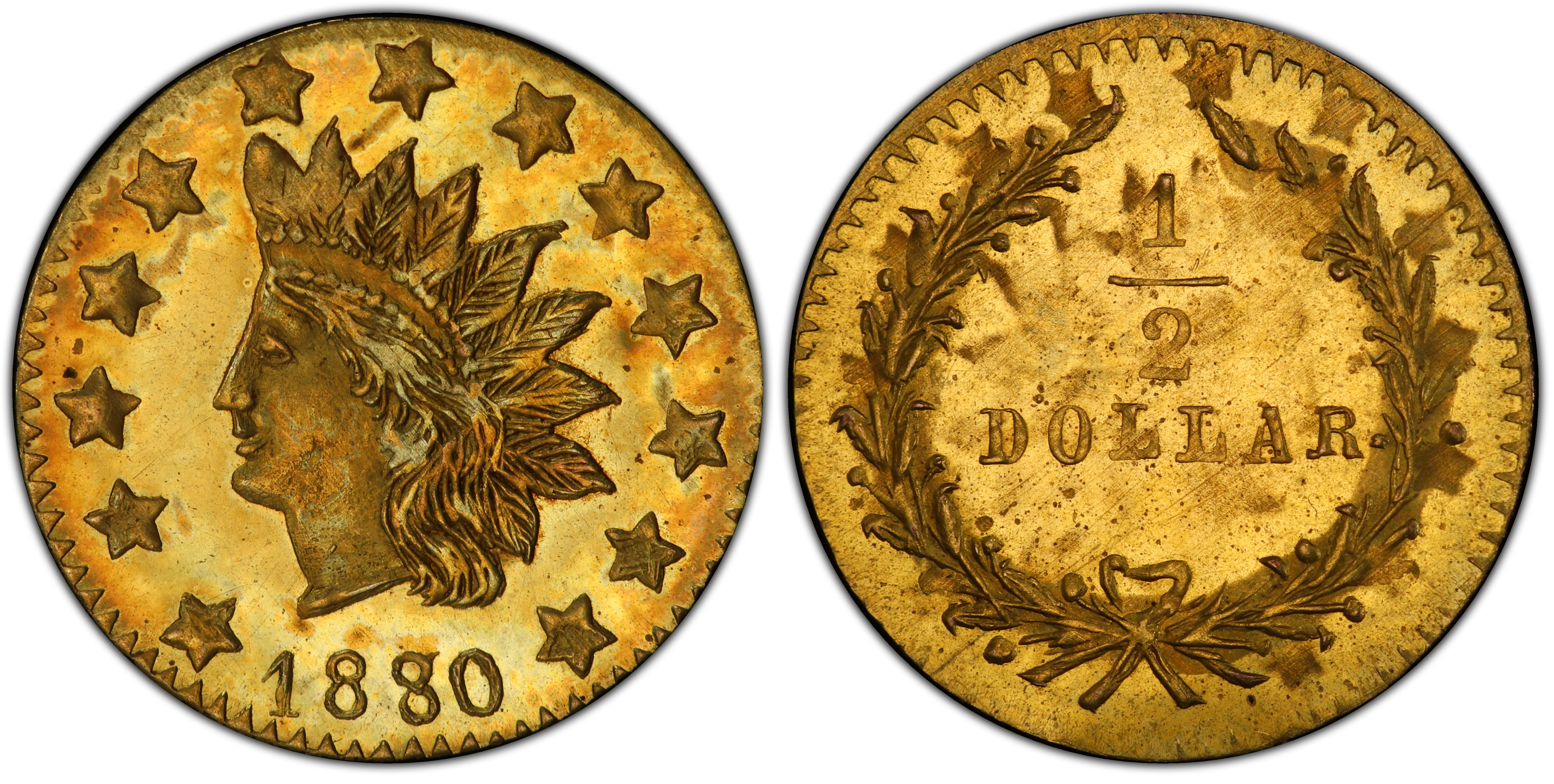Obverse DescriptionThe obverse features a left-facing Indian Head, likely modeled after the contemporary U.S. Indian Head cent. The portrait wears a feathered headdress. The design is encircled by 13 six-pointed stars, representing the original colonies. The date, 1880, is positioned below the bust truncation and clearly shows an 8 punched over a 7 from an earlier 1870 die.