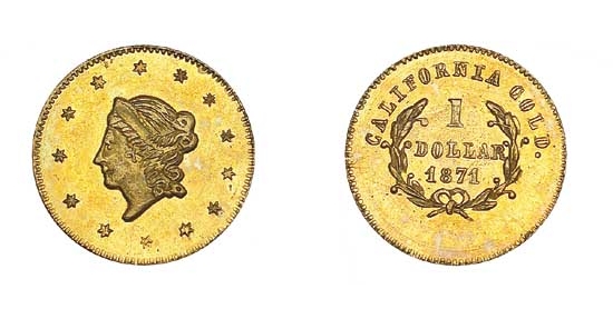 Obverse DescriptionA small, delicate Liberty Head facing left, similar in style to the contemporary federal gold dollar but often of cruder execution. The portrait is surrounded by 13 six-pointed stars. The date '1871' is positioned below the bust.