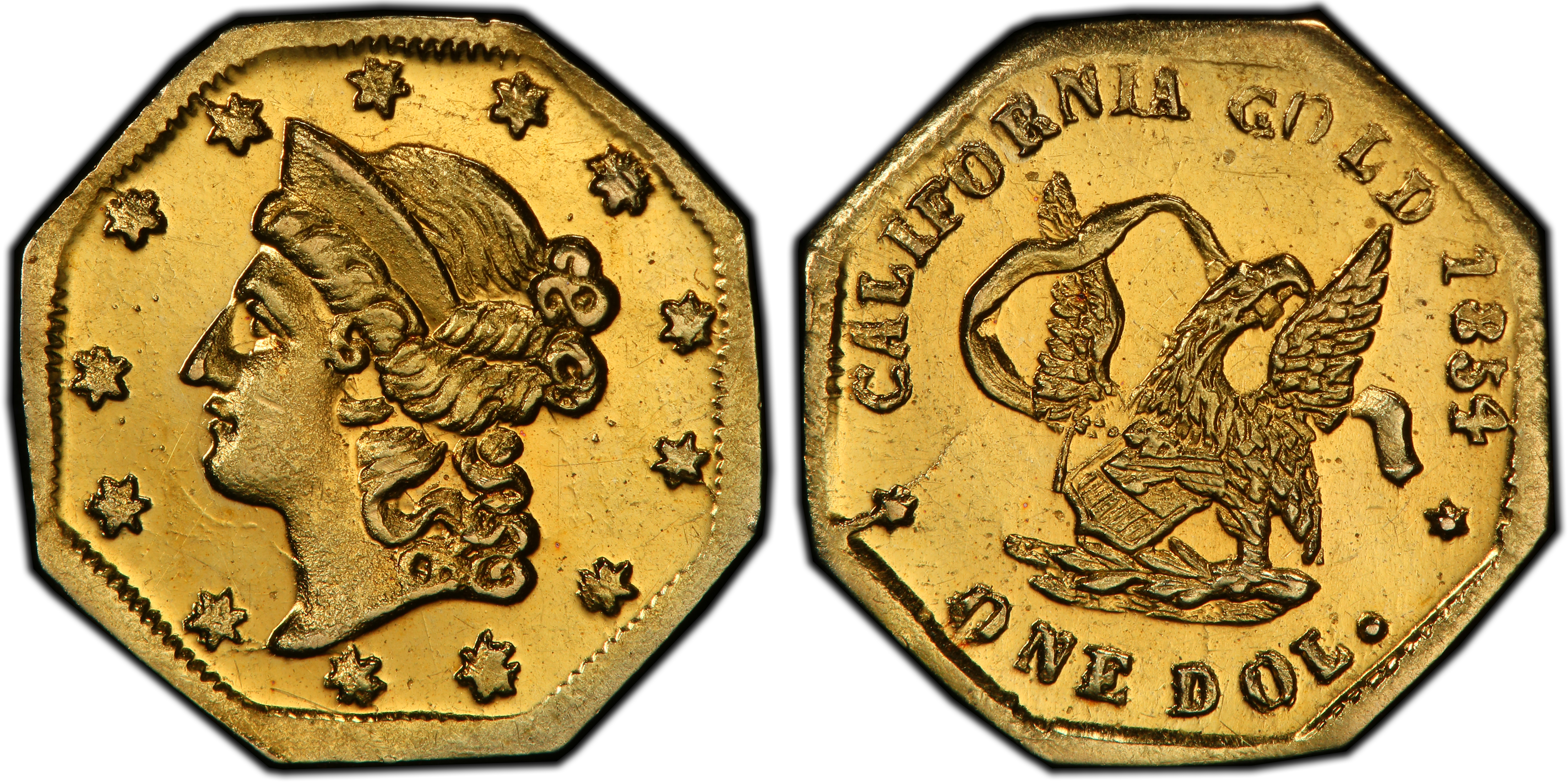 The 1854 BG-504 octagonal one-dollar piece is a quintessential artifact of the California Gold Rush, a direct response to the chronic shortage of small-denomination coinage that plagued the booming economy of the West. Following the discovery of gold at Sutter's Mill in 1848, a massive influx of prospectors and merchants descended upon California, creating instant cities and rampant commerce. However, the nearest United States Mint was in Philadelphia, an arduously long and dangerous journey away. While gold dust and nuggets served for larger transactions, the need for divisible, reliable currency for everyday purchases was acute. Into this void stepped private minters, often jewelers or assayers, who began striking their own coins from the plentiful local gold. These 'California Fractional Gold' pieces, issued in denominations of 25 cents, 50 cents, and one dollar, became the lifeblood of local trade. The BG-504 belongs to 'Period One' (1852-1856) of this coinage, a time when the pieces were genuinely intended for circulation and were generally of good weight and fineness, closely mimicking federal issues. Their distinctive octagonal shape, along with round counterparts, made them instantly recognizable. The reverse of the BG-504 is particularly noteworthy for its 'Humbert Eagle' design, a direct imitation of the heraldic eagle used by the prestigious U.S. Assay Office under Augustus Humbert on its iconic $50 'slugs.' This was a clear attempt to leverage the public's trust in the quasi-official Humbert issues. These tiny coins, however, proved difficult to handle and easy to lose, and their intrinsic value was often slightly less than their face value. As the San Francisco Mint began full-scale operations in 1854, the necessity for these private issues waned, and many were eventually melted down. The Coinage Act of 1864 officially outlawed private coinage, though production of souvenir pieces continued until the early 1880s. Today, the BG-504 is prized not just for its rarity, but as a tangible link to the vibrant, chaotic, and entrepreneurial spirit of the Gold Rush.
