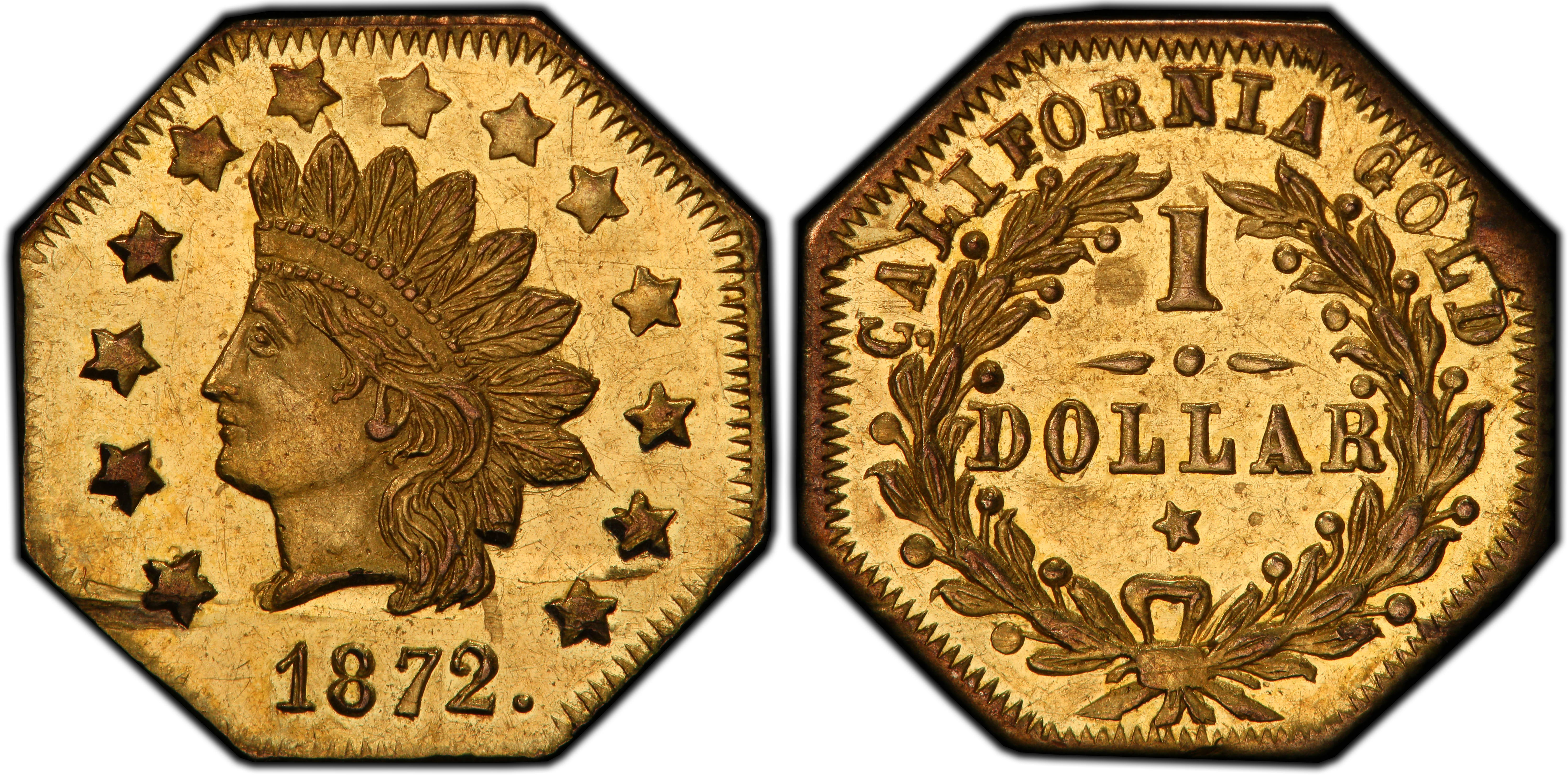 This octagonal one-dollar piece is highly sought after for its classic Indian Head design, octagonal shape, and high rarity. As a representative of the 'souvenir' era of fractional gold, it tells a unique story about California's history and the public's fascination with the Gold Rush. High-grade and prooflike examples are particularly prized by specialists.