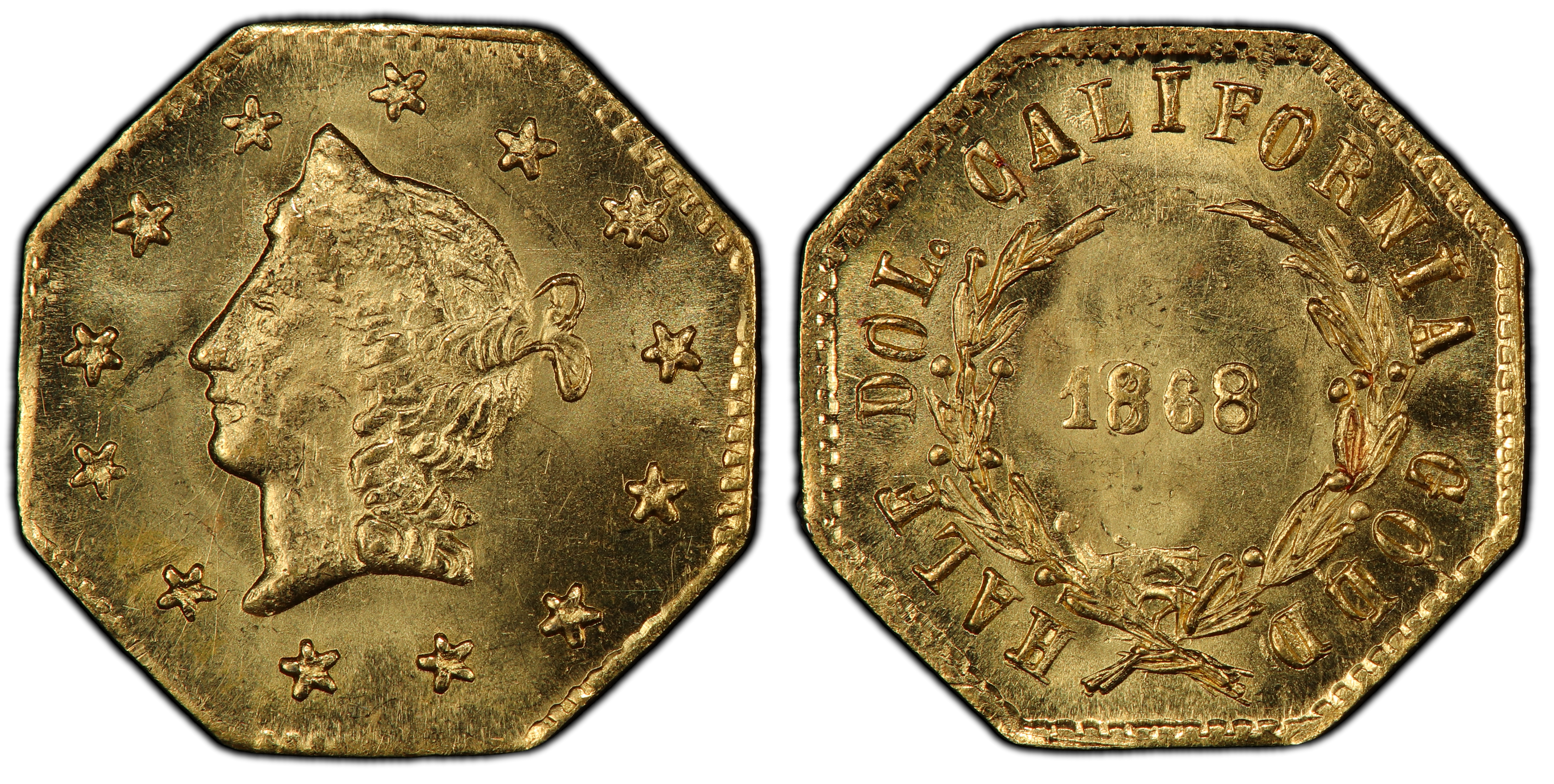 Reverse DescriptionOctagonal planchet. The denomination '1/2' appears within a wreath of two branches tied with a bow at the bottom. The legend 'CALIFORNIA GOLD' surrounds the wreath along the periphery.