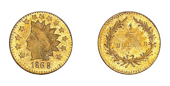 Obverse DescriptionFeatures a stylized Indian Princess head facing left, a popular motif for the era. The portrait is typically surrounded by 13 six-pointed stars representing the original colonies. The date '1868' is positioned below the bust.