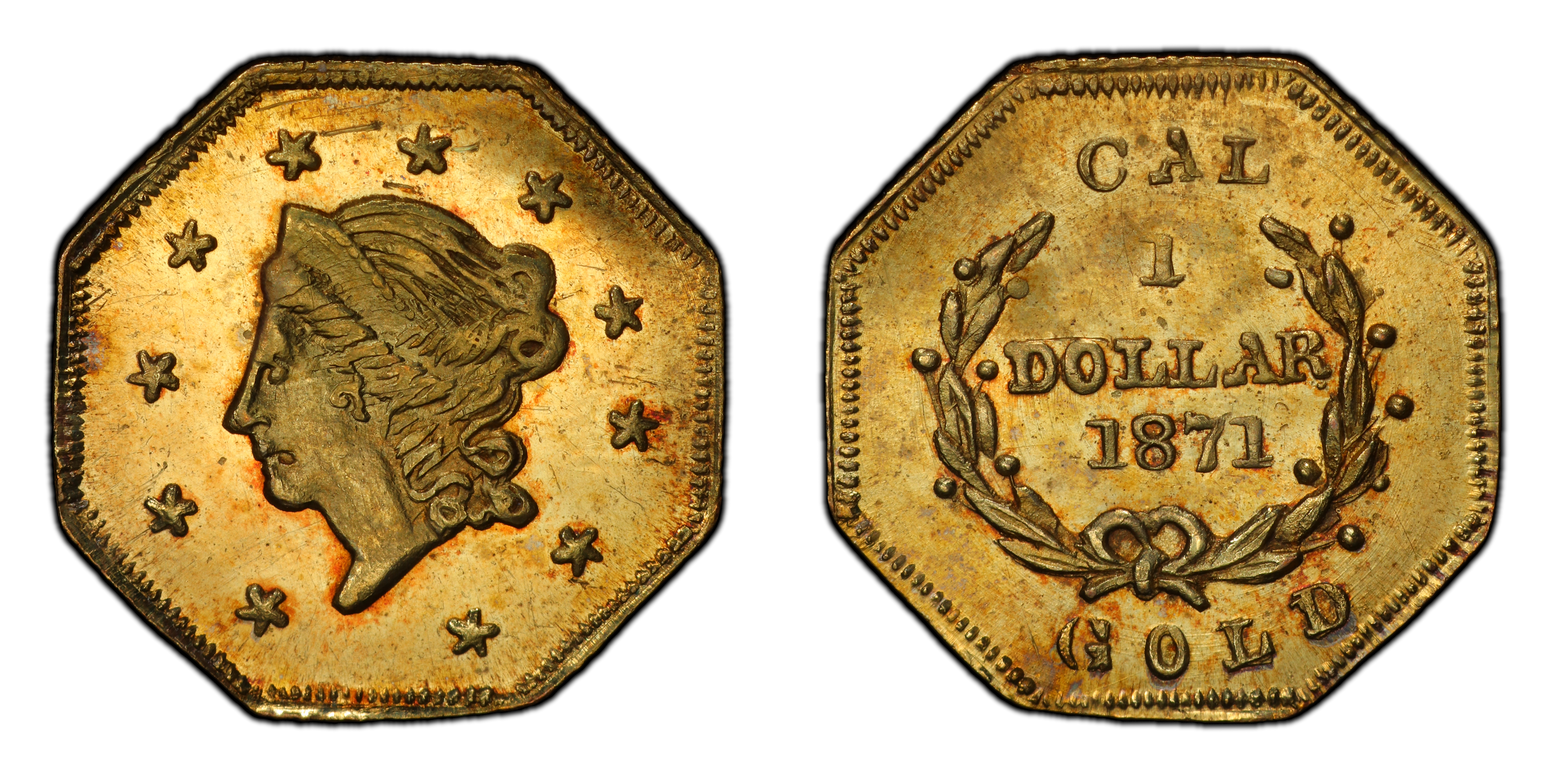 Authentication TipsAuthentic examples often show a somewhat crude, hand-finished quality. Look for sharp, well-defined corners on the octagonal planchet. The lettering and stars, while potentially unevenly struck, should have a particular style consistent with known genuine pieces. Counterfeits are common and may be gold-plated brass or have incorrect weights and mushy details. Diagnostics for the BG-1104 die pair include the specific positioning of 'CAL.' and 'GOLD' and the style of the numeral '1' on the reverse. Comparison with high-resolution images of certified examples is crucial.
