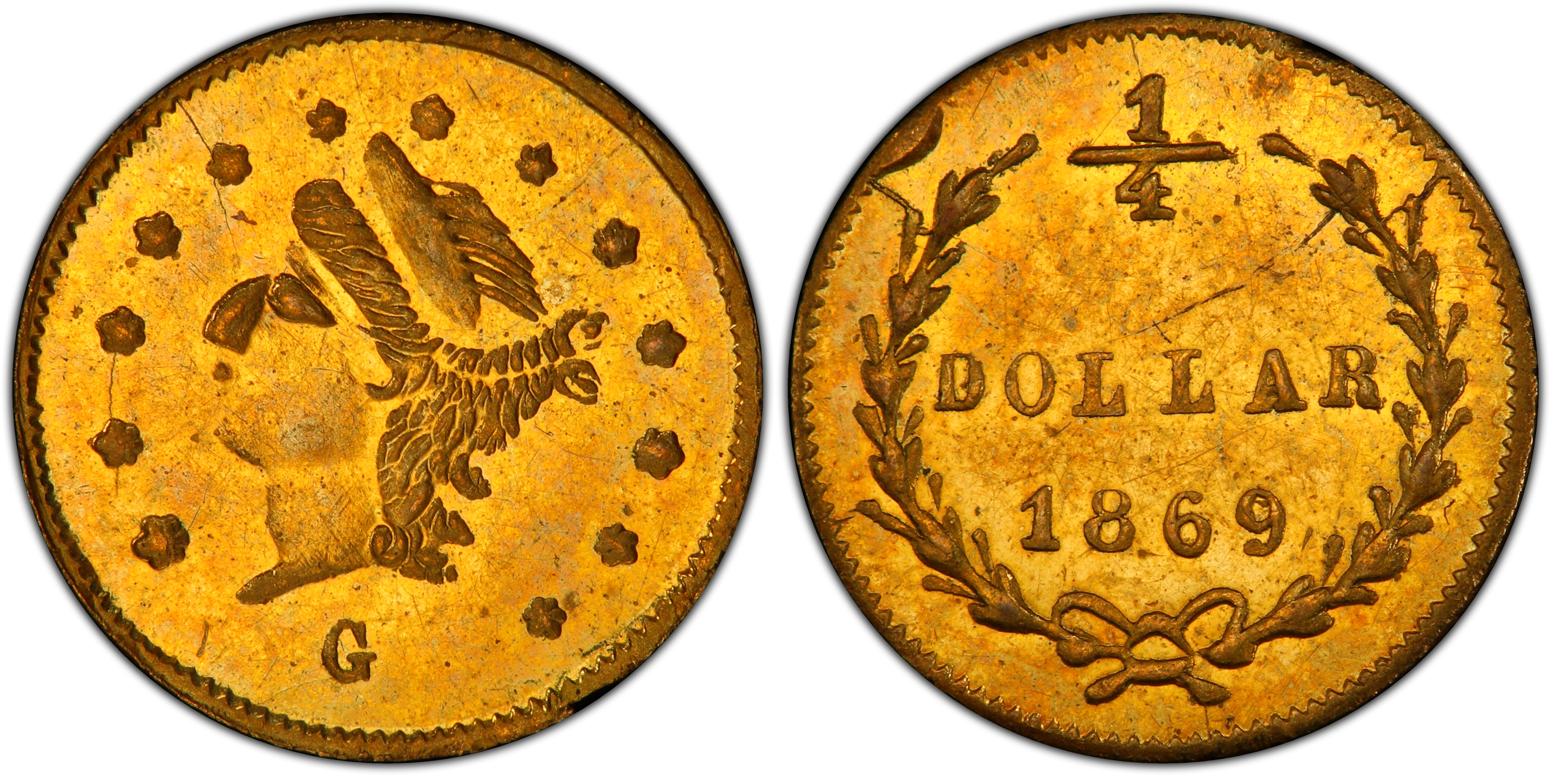 The 1869 G25C BG-829 is a quintessential example of a 'Period Two' California Fractional Gold piece, a fascinating series born from the unique economic conditions of the American West. Following the initial California Gold Rush, the U.S. Mint's output of small denomination coinage struggled to keep pace with the explosive commercial growth, particularly in remote California. The first wave of fractional gold, 'Period One' (1852-1857), consisted of privately-minted quarter dollars, half dollars, and dollars that were generally of good weight and intended to alleviate this severe shortage of pocket change. However, by the late 1850s, the San Francisco Mint was in full operation and the acute need for these private issues had subsided. This gave rise to the 'Period Two' issues (1858-1882), which served a different purpose. These pieces, often called 'jeweler's issues,' were primarily created as souvenirs, keepsakes, and novelty items for tourists and locals nostalgic for the Gold Rush heyday. The BG-829 falls squarely into this category. It was struck by Robert B. Gray & Co., a prominent San Francisco jeweler who had purchased the business and equipment of an earlier fractional gold pioneer, Antoine Nouizillet, around 1859. Gray continued to produce these small gold tokens, often marking his work with a characteristic 'G' on the obverse, as seen on many of his varieties. These Period Two pieces were not intended to circulate as money in the same way as their predecessors. Their gold content was often less than their face value, and their manufacture was a commercial enterprise aimed at the jewelry and souvenir trade. The Coinage Act of 1864 officially outlawed private coinage, but the law was not strictly enforced against these small tokens until the Secret Service cracked down in 1883. This legal gray area allowed jewelers like Robert Gray to produce a wide variety of designs throughout the 1860s and 1870s, contributing to a rich and complex numismatic series. The BG-829, with its 1869 date, represents a period of peak production for these popular souvenirs, reflecting a prosperous and growing San Francisco that was capitalizing on its romantic Gold Rush past.