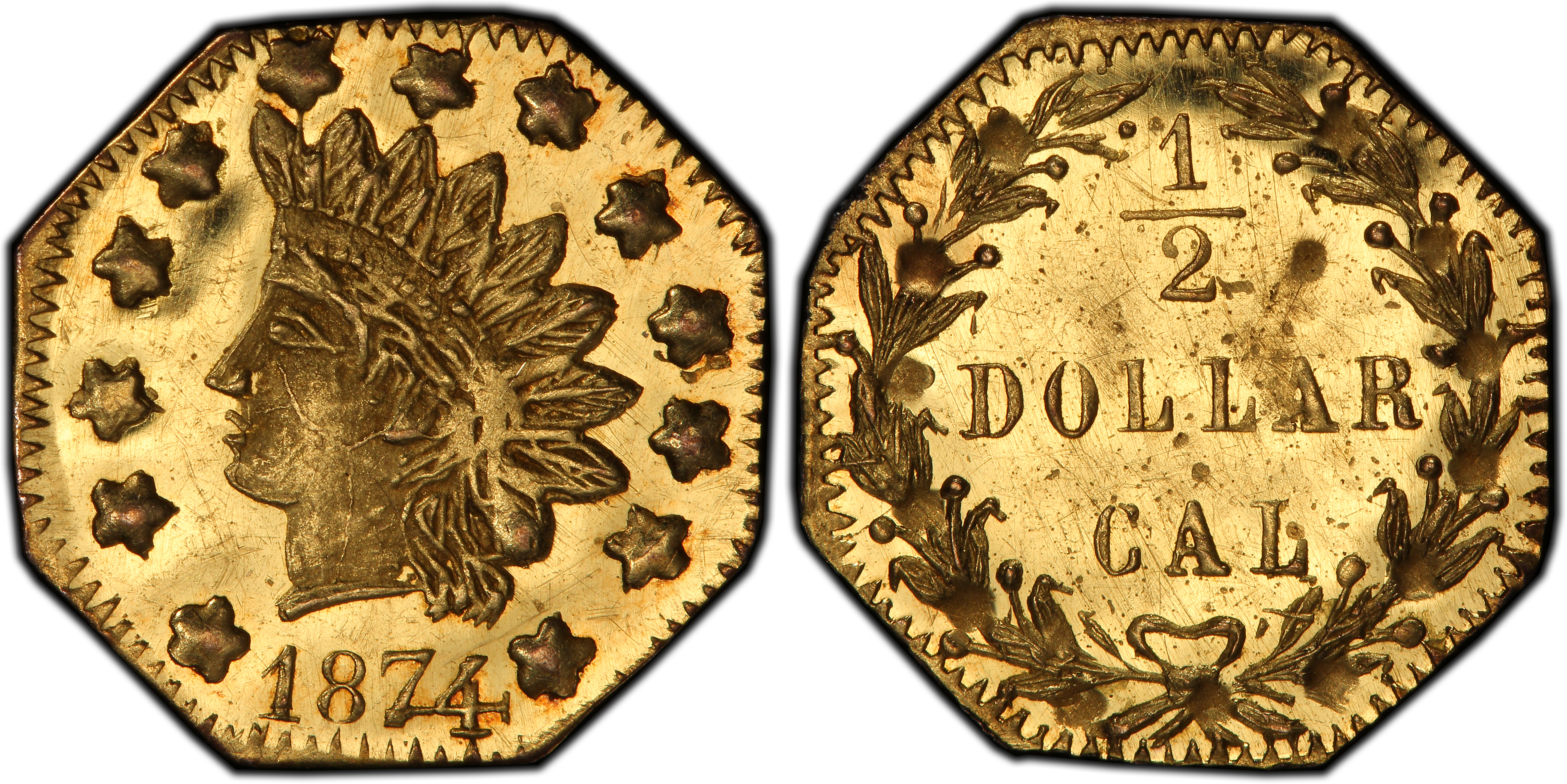 The 1874 BG-944A 50 Cent piece emerged during the second major period of California Fractional Gold production (1872-1882), a fascinating era that followed the suppression of private coinage by the Act of April 22, 1864. While the initial period (1852-1857) saw these small-denomination coins serve a vital role in local commerce due to a shortage of federal coinage, the later period pieces were created under different pretenses. By the 1870s, the immediate, acute need for circulating small change had been largely met by federal issues. Instead, these later 'fractionals' were primarily minted as souvenirs and keepsakes, catering to a nostalgic public, tourists, and merchants who used them as novelties or promotional items. Jewelers and private minters, operating in a legal gray area, carefully designed these tokens to resemble currency without explicitly violating federal law. They often omitted the word 'DOLLAR' or used designs that were distinct from official U.S. coinage. The BG-944A, attributed to the California Jewelry Company, is a quintessential example of this later period. It features a popular Indian Head motif, reminiscent of the U.S. gold dollar, but is denominated as '50 CENTS'. These pieces were struck in large quantities compared to their earlier counterparts and were often sold in sets or mounted into jewelry. Their widespread production speaks to the enduring romanticism of the Gold Rush and the clever marketing of San Francisco's metallurgists and jewelers who found a new market for gold products long after the placer mines had peaked. Despite their souvenir nature, they are avidly collected today as an integral part of the Territorial gold story, representing the commercial and cultural evolution of post-Gold Rush California.