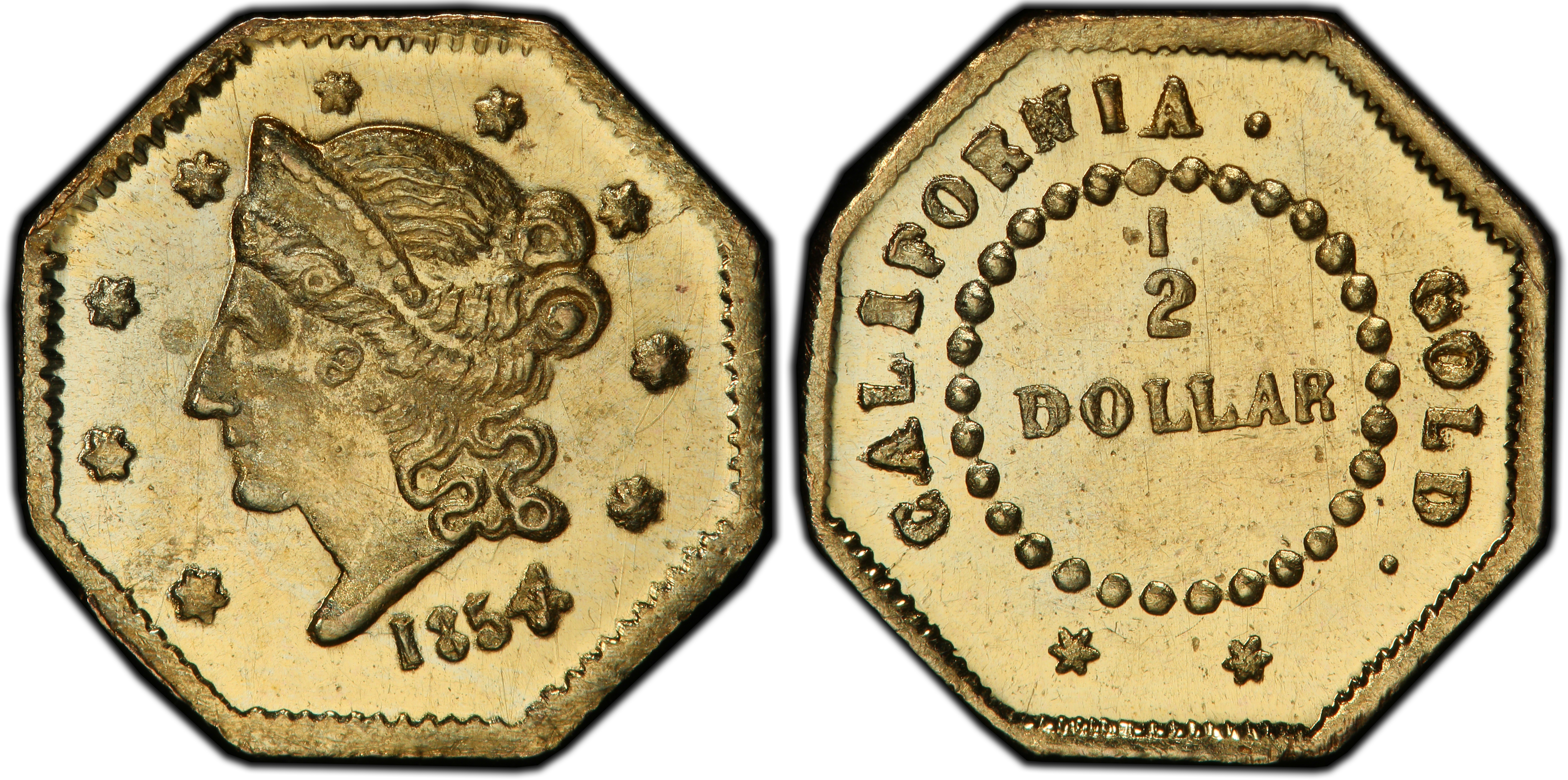 The 1854 Octagonal Liberty Head 50 Cents, cataloged as Breen-Gillio 305, is a quintessential artifact of the California Gold Rush's 'Period One' (1852-1857) private coinage. The discovery of gold at Sutter's Mill in 1848 triggered a massive influx of population and gold dust into California, but a severe shortage of circulating small-denomination coinage created a chasm in the region's burgeoning economy. Simple transactions were often conducted with pinches of gold dust, an inaccurate and cumbersome method. Federal efforts were slow to respond; the San Francisco Mint would not open until April 1854 and its initial output was insufficient to meet the rampant demand. In this vacuum, private minters, primarily jewelers and assayers in San Francisco with the requisite skills in metallurgy, stepped in to fill the void. These entrepreneurs began striking fractional denominations—25 cents, 50 cents, and one dollar—from native California gold. The BG-305 is a product of this environment of necessity and ingenuity. Struck in 1854, the very year the federal mint opened, it represents a direct competitor and a vital supplement to official coinage. These early issues were genuinely intended for commerce and were accepted, albeit unofficially, in local trade. Their diminutive size, however, soon proved impractical, and many were quickly repurposed as souvenirs and keepsakes to be sent back East, tangible proof of the holder's participation in the great adventure. This dual role as both circulating medium and souvenir is key to understanding their history and survival rates. The Coinage Act of 1864 eventually outlawed all private currency, cementing the status of these Period One issues as a finite and historically encapsulated series.